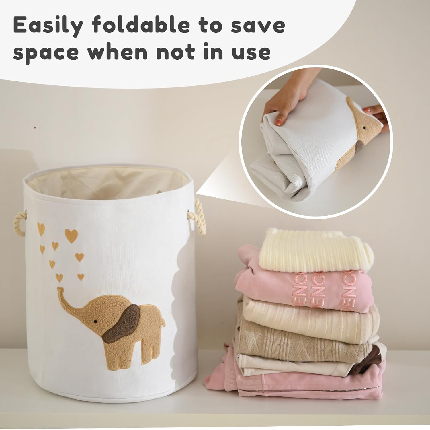 Collapsible and Easy to Carry: Our kids hampers is designed to be collapsible for effortless storage. You can fold up the baskets when they are not in use, allowing them to take up minimal space. This nursery hamper features two cotton rope handles that are soft and stretchy, making it easy to transport from room to room. Packing list: 1 x brown elephant baby hamper.