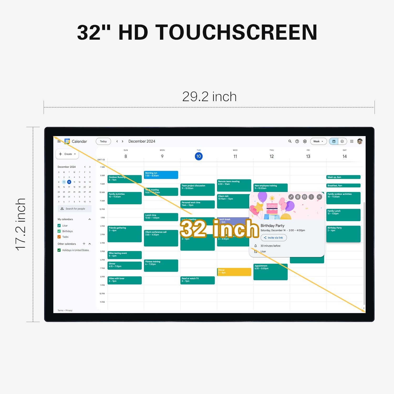 Stunning HD Smart Touch Screen:The 32″ WiFi digital calendar comes equipped with a high quality FHD 1920*1080 resolution IPS touchscreen,providing stunning visuals from any angle.Whether you’re looking at your schedule,organizing household tasks,or enjoying photos,everything is shown with exceptional clarity,improving your overall experience