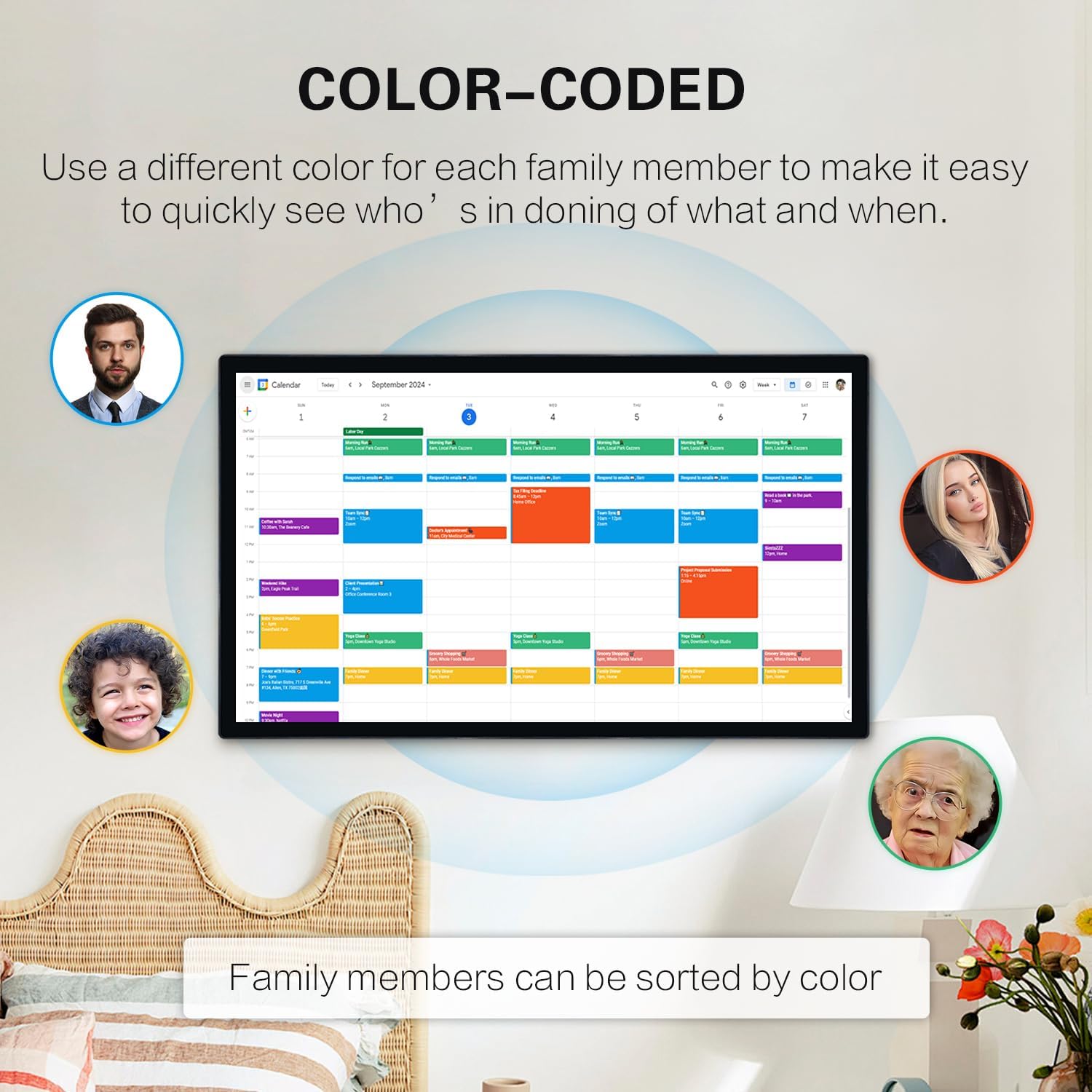 All-in-One Smart Family Digital Calendar:this cutting-edge smart family calendar merges the features of a digital calendar and planner with the bonus of a digitalphoto frame. It’s easier than ever to keep the whole family in the loop by giving each member their own color and set of chores.The touchscreen interface makes it easy to schedule and view each family member’s tasks and plans, helping you effortlessly organize and manage daily activities.