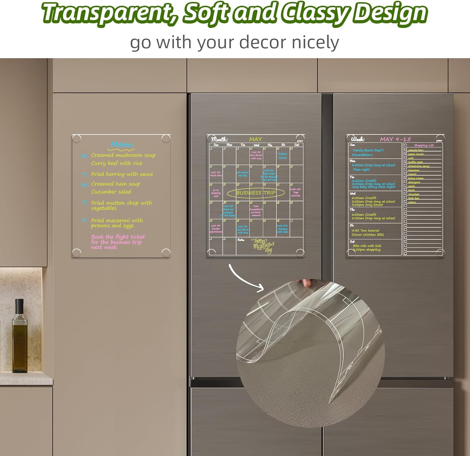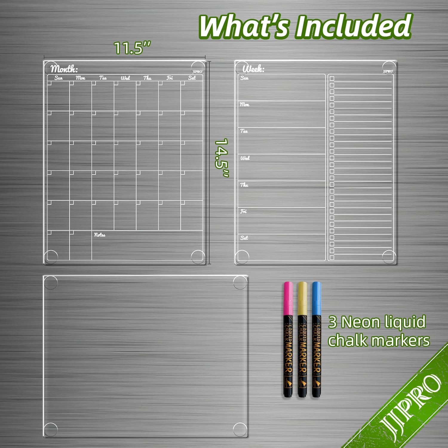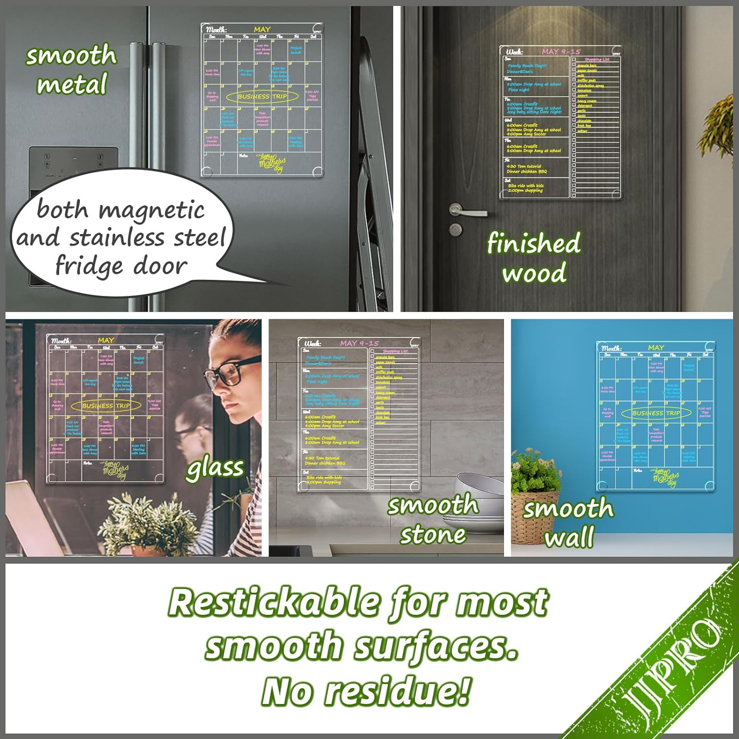 JJPRO Non-Magnetic Dry Erase Calendar for Fridge-Reusable Monthly&Weekly Planning Board and Blank Clear Board Bundle for All Smooth Surfaces. Clear Reusable Board Sticks to Fridge,Wall,Door&Glass