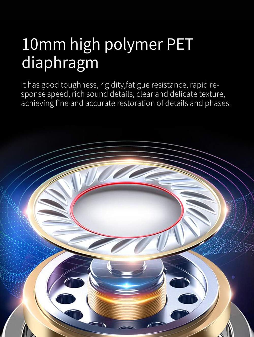 Creative Dynamic Driver: 10mm high polymer PET diaphragm, It has good toughness, rigidity, fatigue resistance, rapid response speed, rich sound details, clear and delicate texture, achieving fine and accurate restoration of details and phases.