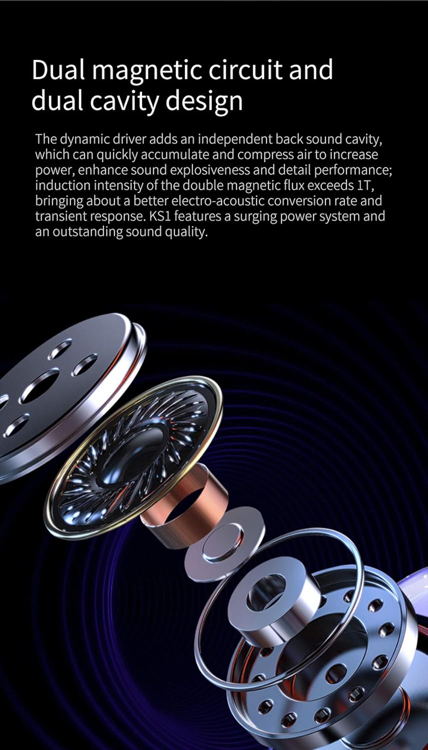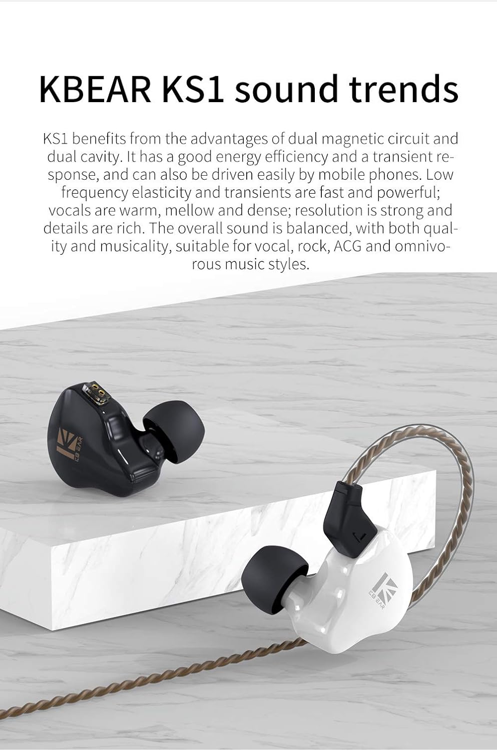 1DD HIFI KBEAR KS1 Earphone: Equipped with 1 Dynamic Driver – Dual magnetic circuit and dual cavity in this KBEAR KS1 1DD earphones, the driver adds an independent back sound cavity, Which can quickly accumulate and compress air to increase power, enhance sound explosiveness and detail performance.