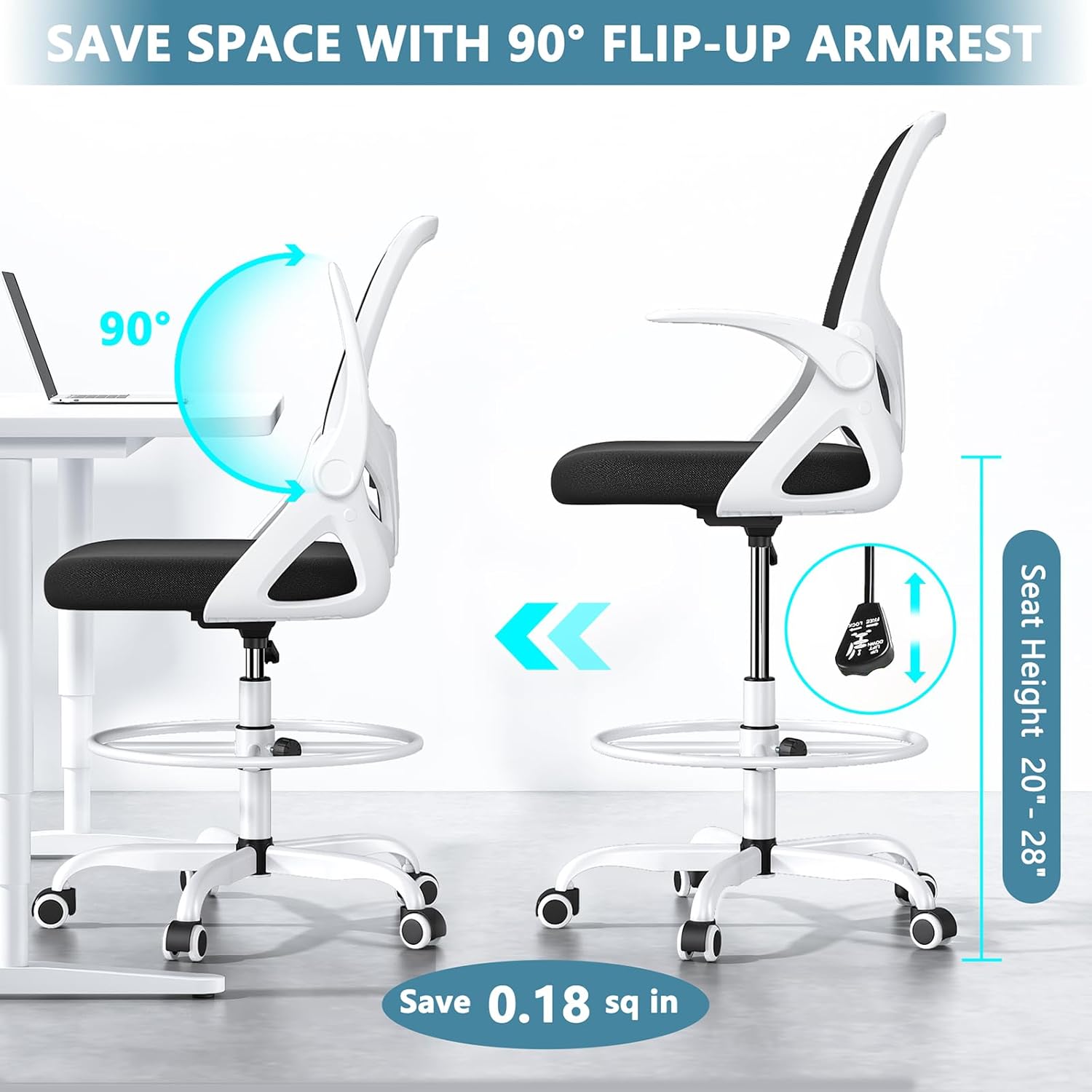 Tall Office Drafting Chair: This high rotary drawing chair has a footrest stool with adjustable height, and the 90 degree overturned armrest design can save a certain amount of space, which is very suitable for standing desks, sitting desks and bars. Our tall office drafting chair is equipped with a round foot ring, which can help you move your feet more frequently, reduce the pressure on the back of your legs and improve comfort