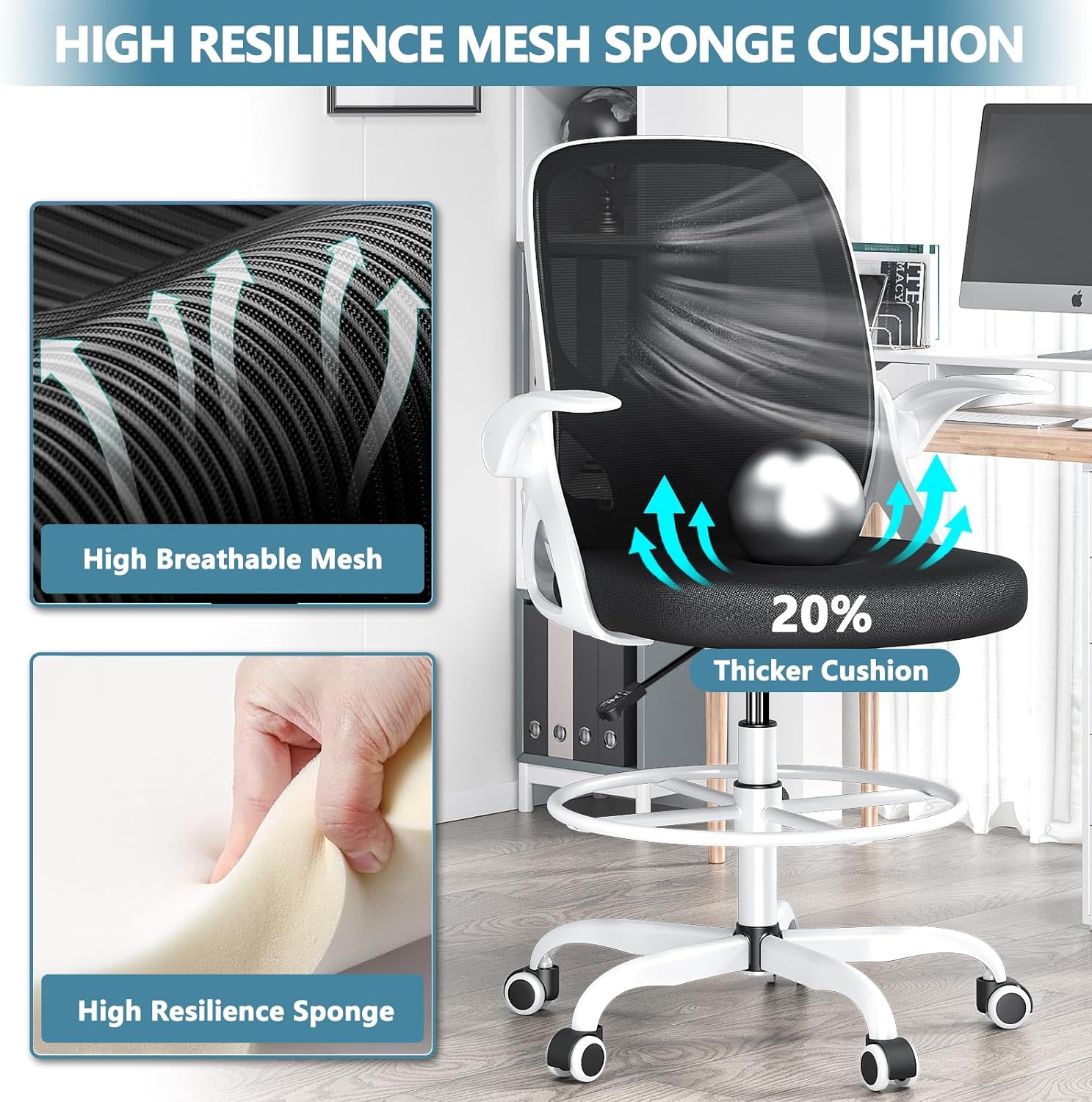 Breathable and Comfortable Tall Office Chair: The backrest are made of high-quality breathable polyester mesh to keep you cool and comfortable. High-density foam-filled seat cushion resists deformation to provide the support that lasts all day long. Comfy standing desk chair