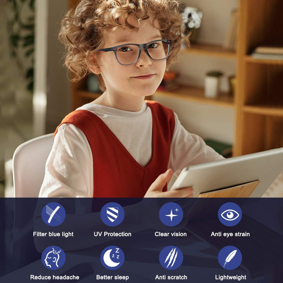 *BLUE LIGHT BLOCKING LENS — These non-prescription glasses protect your children’s developing eyes from the harmful blue light that computers, tablets, mobile devices and game consoles transmit, reduce headaches, dry eyes, eye fatigue and myopia risk. The glasses are suitable for 5 to 12 years old boys and girls.