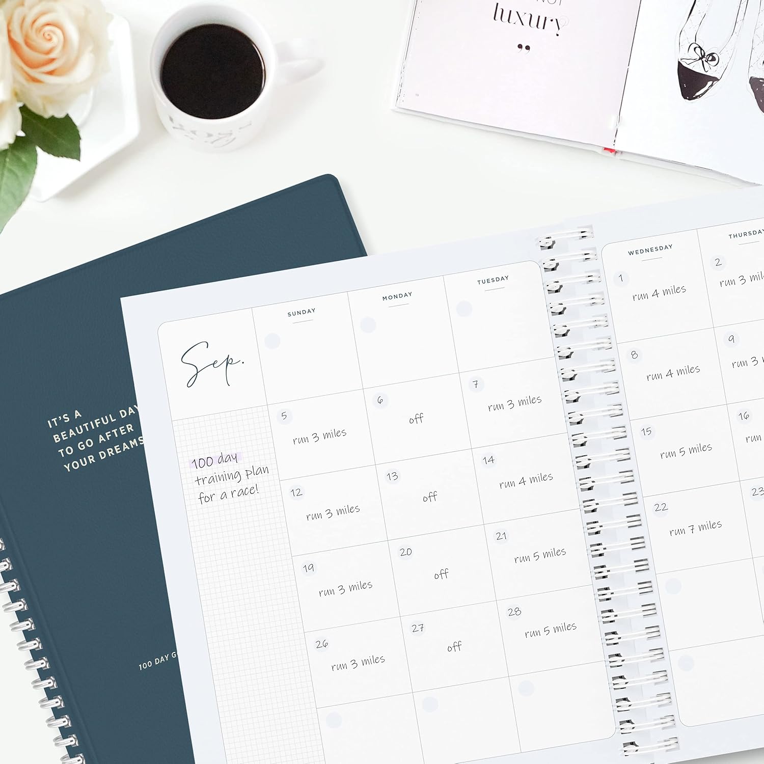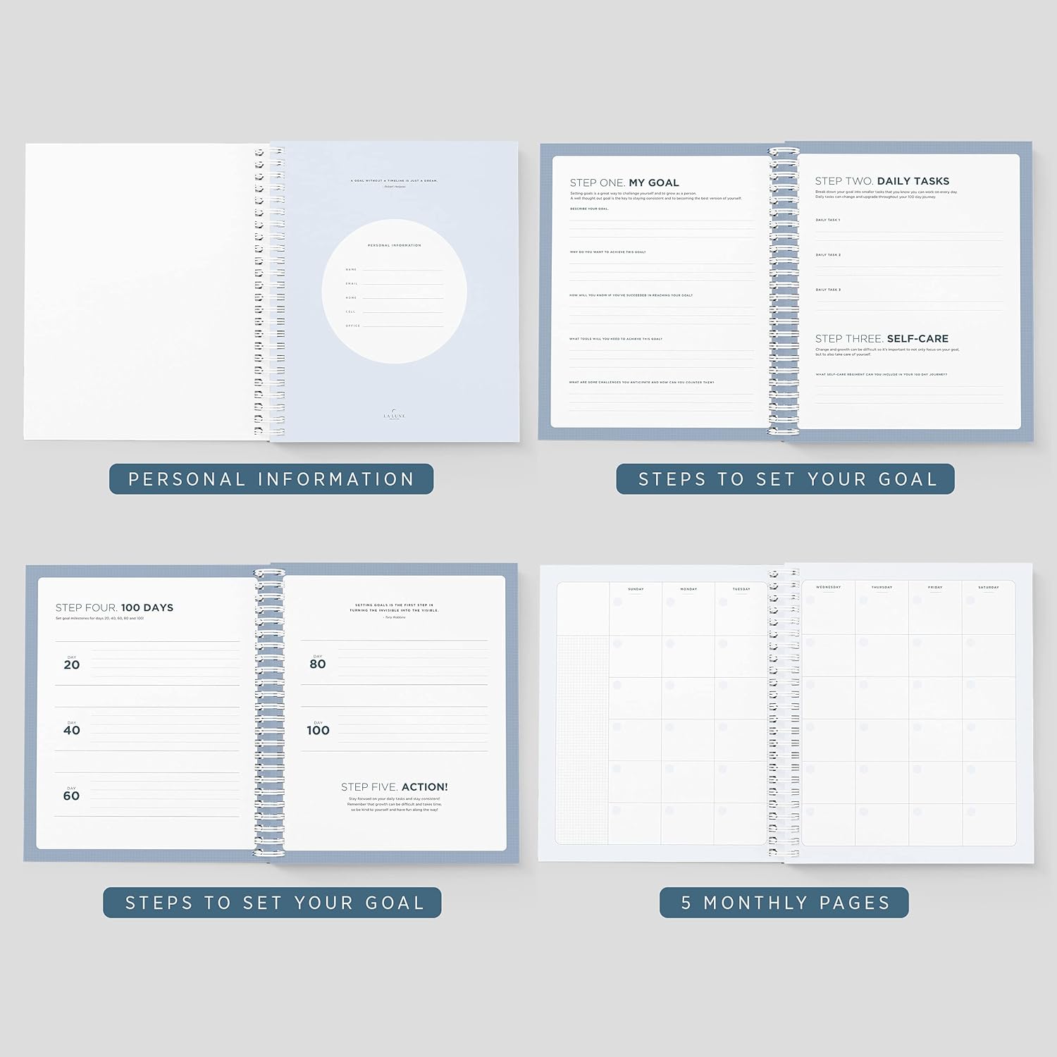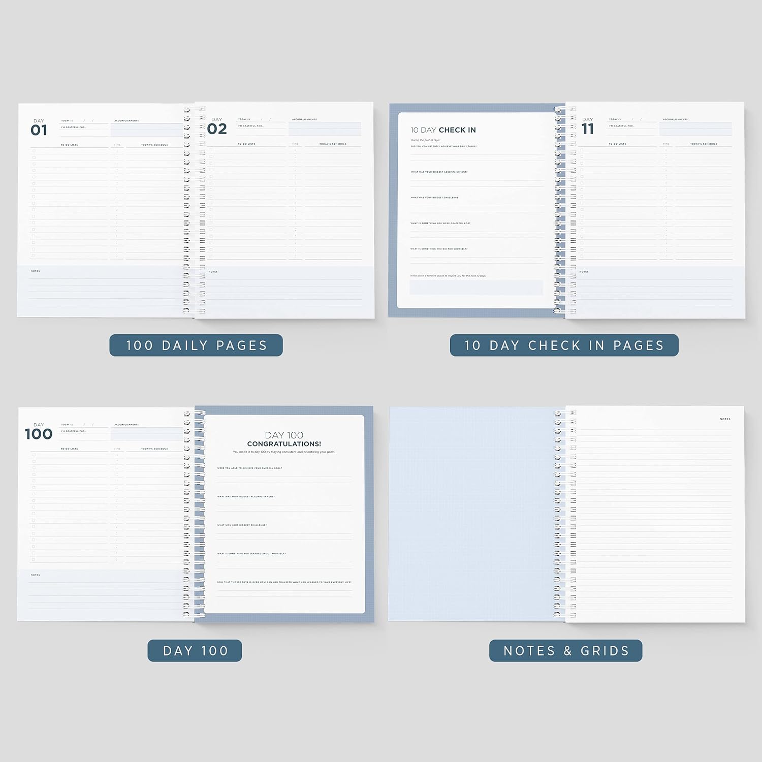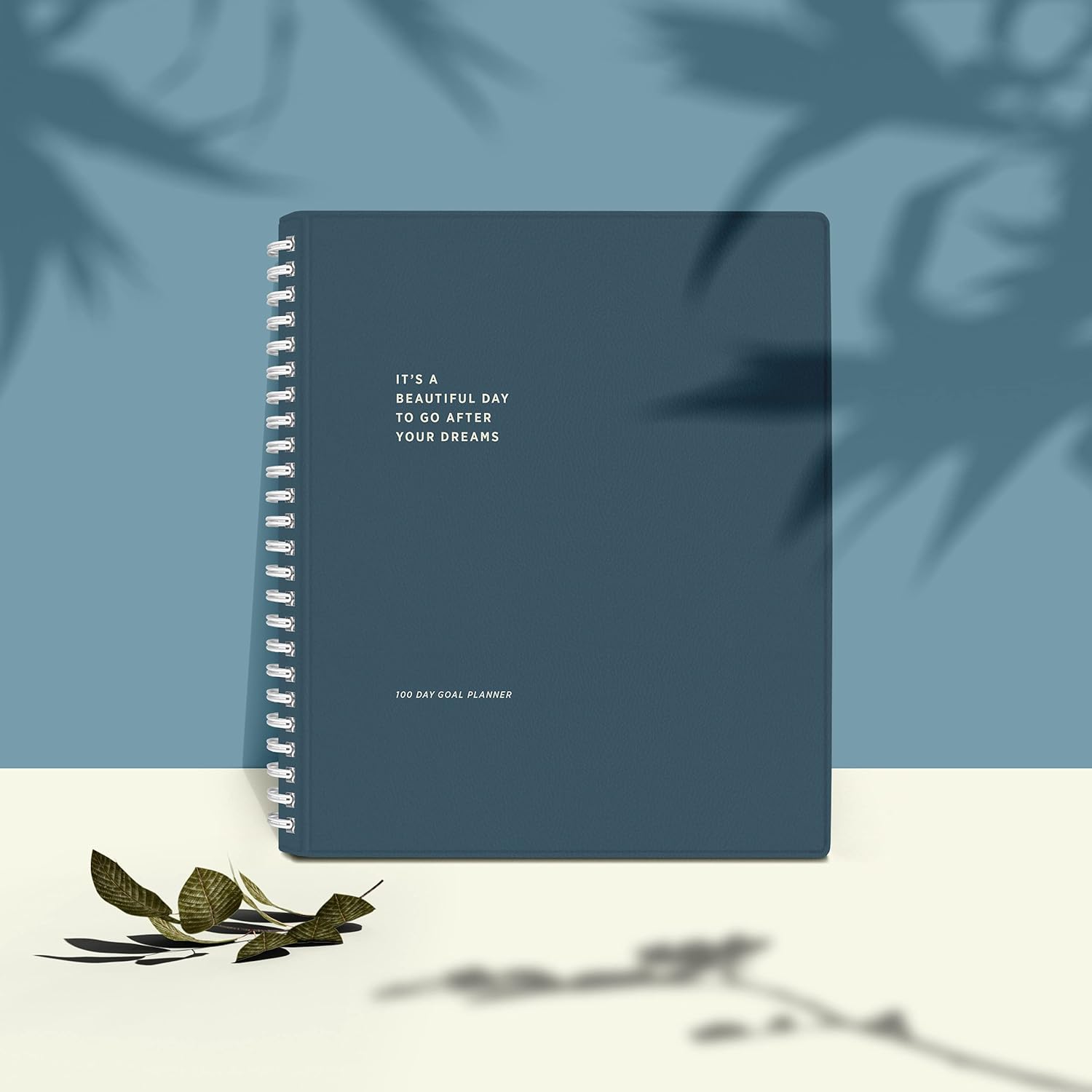 At first I wasn’t crazy about the type of cover on the planner, as there is no description of the material in the listing and I expected a soft or slightly rigid heavy paper cover. It is probably best described as a rubber/vinyl cover over rigid cardboard. I was disappointed in the “plastic” feel of the planner cover right up to the point when I dripped condensation from my glass onto the journal cover and it wiped up easily with no damage to the planner. I no longer think the cover should be cardboard/paper or any other type of material, since this cover saved my brand-new planner from looking beat-up on Day 1.The paper is fairly heavy, and my pen flows nicely over it with no skips or scratching. There is more room than expected for recording everything from my long-term goals and plans to the daily to-do lists, schedule and notes.There are 5 double-page spreads for creating your own monthly calendar pages. They are undated so you can start your 100 days at any time.The daily pages are numbered with 1-100, and a spot for you to put today’s date, a couple of lines (half page wide) to note accomplishments for the day, about a line and a half (half page wide) to list things you’re grateful for each day, a half-page list of about 17 lines for your to-do list, and the same for your schedule for each day. The bottom of each 1-100 page has 5 lines, full width across the page, for making notes about the day. At the end of the book there is a summary area with a handful of prompts to identify your biggest accomplishment and biggest challenge during the 100 days. The final pages are Notes pages for you to fill up with whatever information you want that might not have fit in with one of the 100 days (I can imagine using this for contact phone numbers, sources for items I might need to purchase as part of this plan, etc.).I wasn’t sure that this would be completely useful to me when I ordered it, but after it arrived I realized that this may be the perfect way for me to track some of my mini-goals – 100 days towards becoming more fluent in another language, or 100 days toward starting to learn piano (a lifelong dream of mine that never seems to get off the ground).There are so many different ways I can imagine using this planner. I wish it came in a variety of colors, but the blue is a nice shade and will look right at home on my desk.