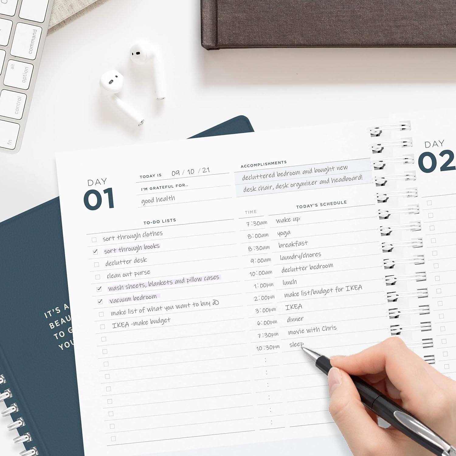 Increase Productivity: Each page has large spaces to record the date, To-Do Lists, Schedules, Accomplishments, Notes, and something you are grateful for.