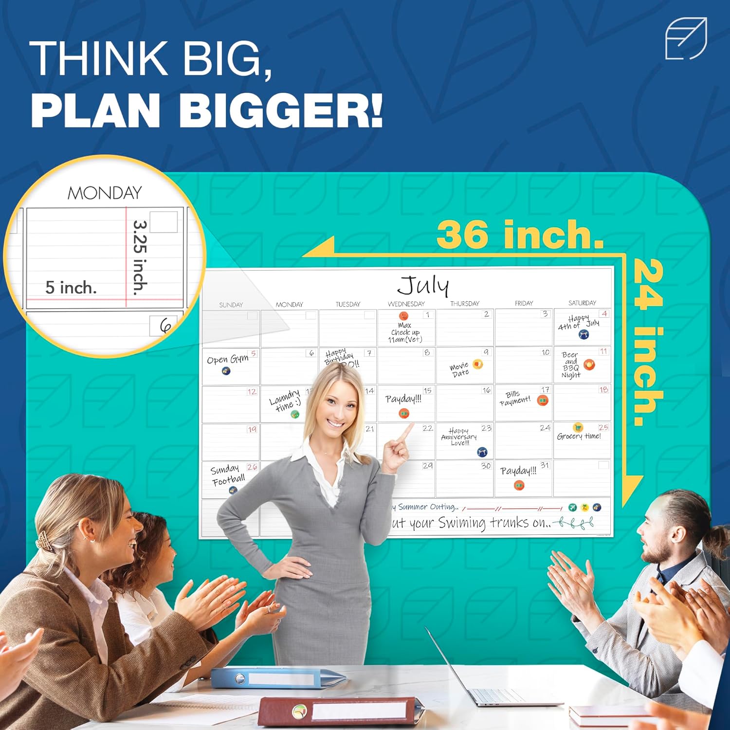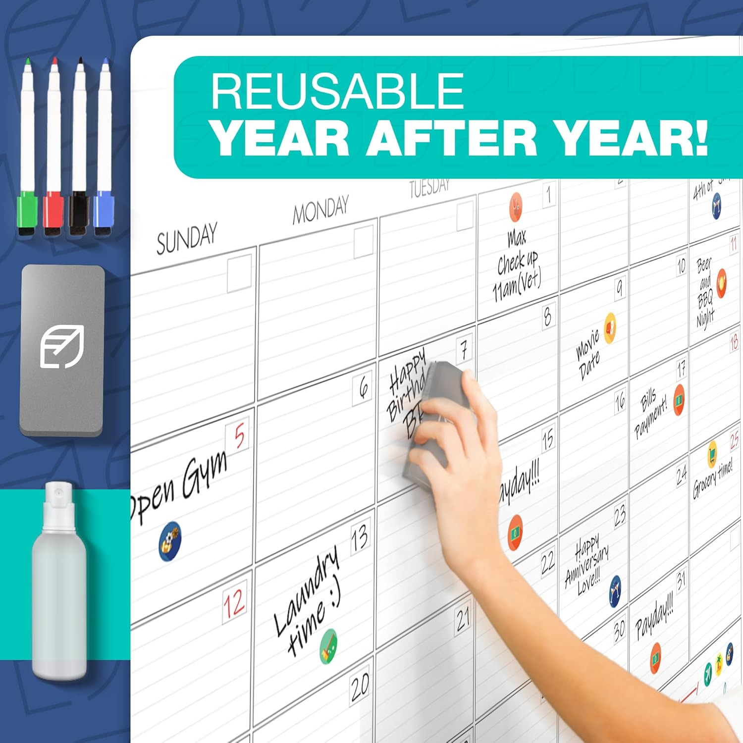 USA Designed & Made 24” x 36” Dry Erase Calendar1 Reusable Icon Sheet (that customers seem to love!)4 Premium Multi Color Dry Erase MarkersWall tacks1 Water Spray Bottle1 Long-Lasting Lushleaf Eraser