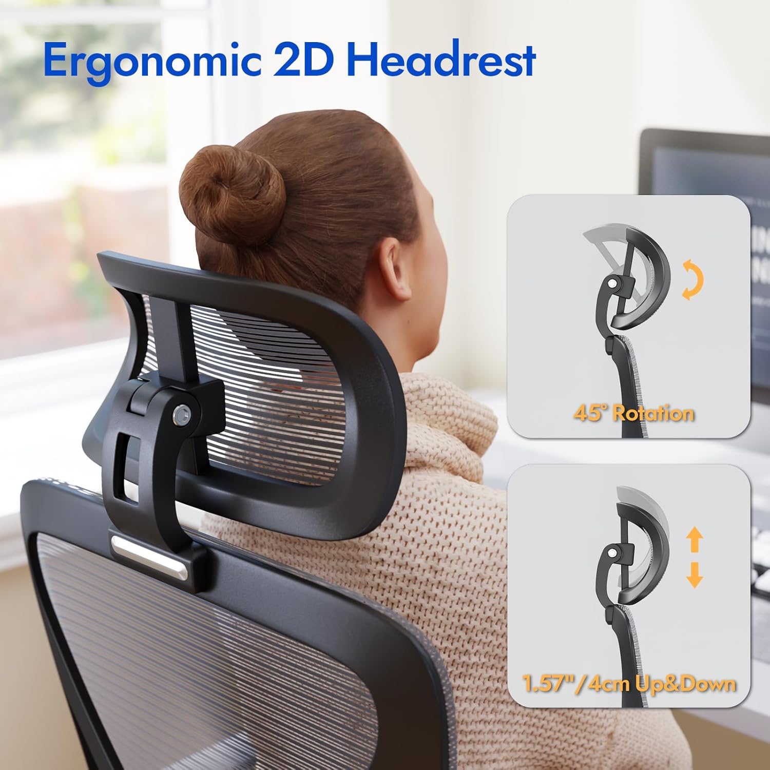 Adjustable Mesh Headrest for Personalized Neck Support: The desk chair features a mesh headrest that adjusts up and down by 1.57″ (4 cm) and rotates 45 degrees, allowing for customizable neck and head support.