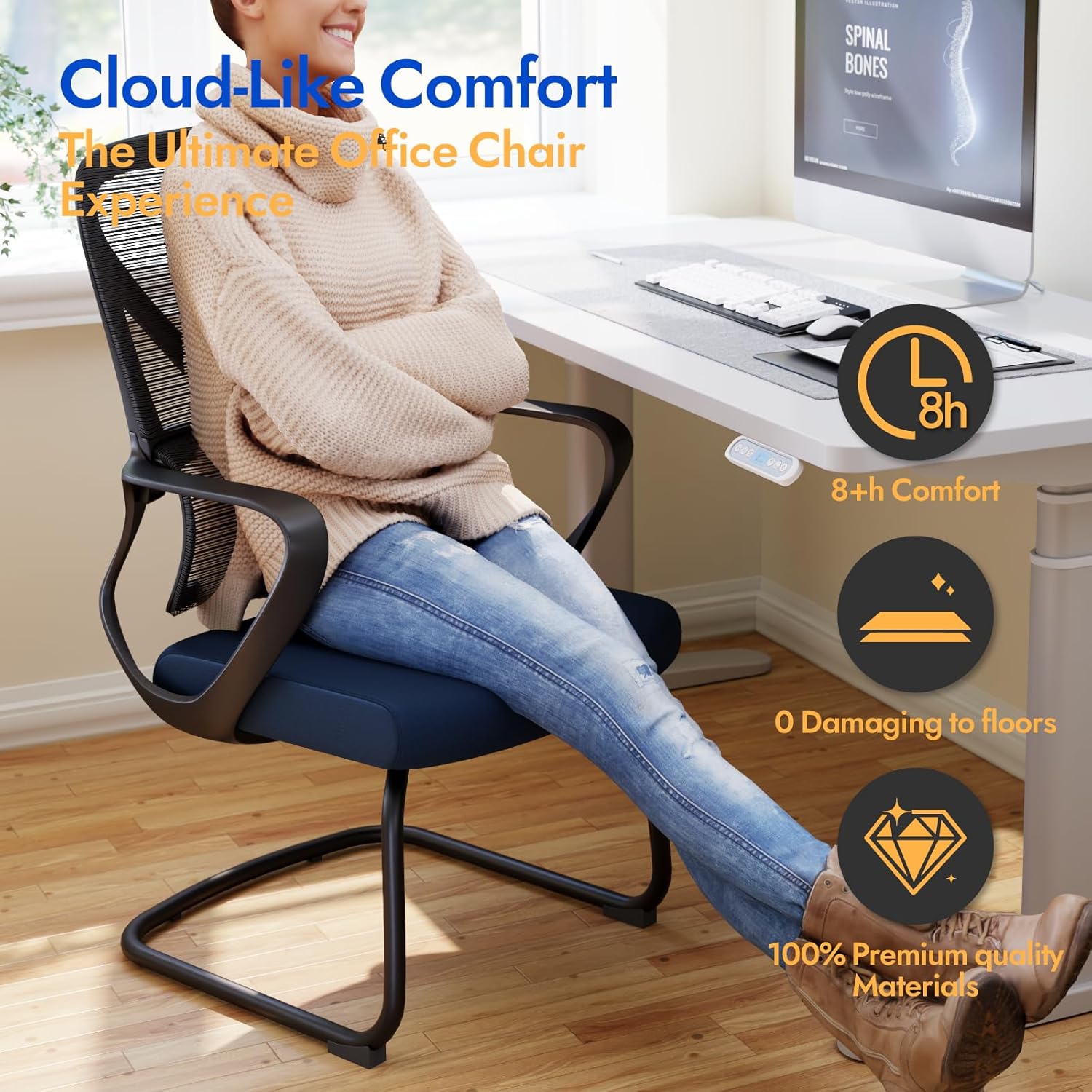 Floor-Safe Sled Base with Modern Appeal: The durable sled base ensures stability while protecting your floors and carpets from scratches. This desk chair is designed for smooth gliding and easy mobility, seamlessly blending functionality with modern aesthetics.