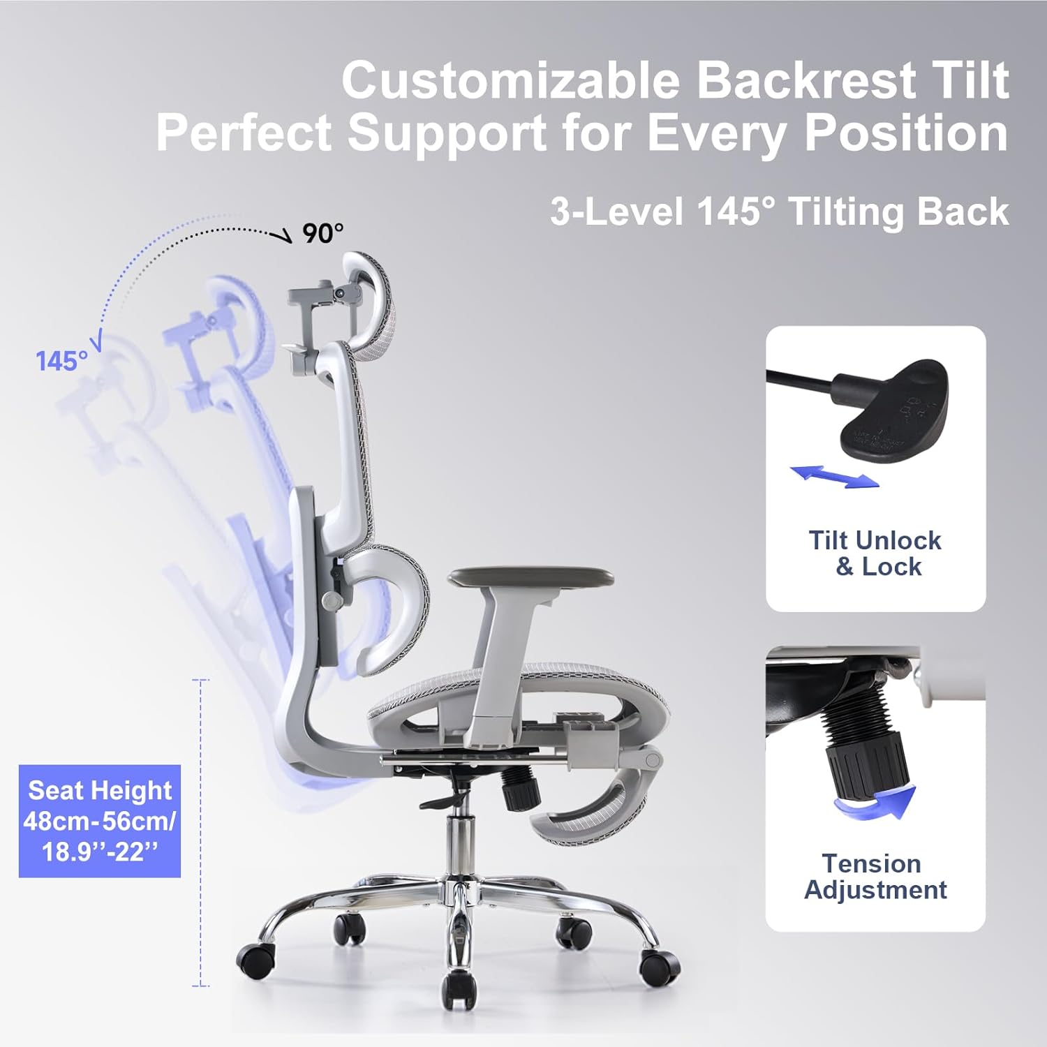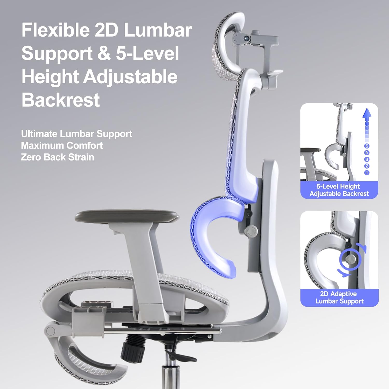 LarkLeaves Office Chair with Footrest, Ergonomic Chair with 3D Headrest, Computer Chair with Adjustable Backrest & 3D Armrest, Gaming Chair with Adaptive Lumbar Support, Mesh Backrest & Cushion,Grey
