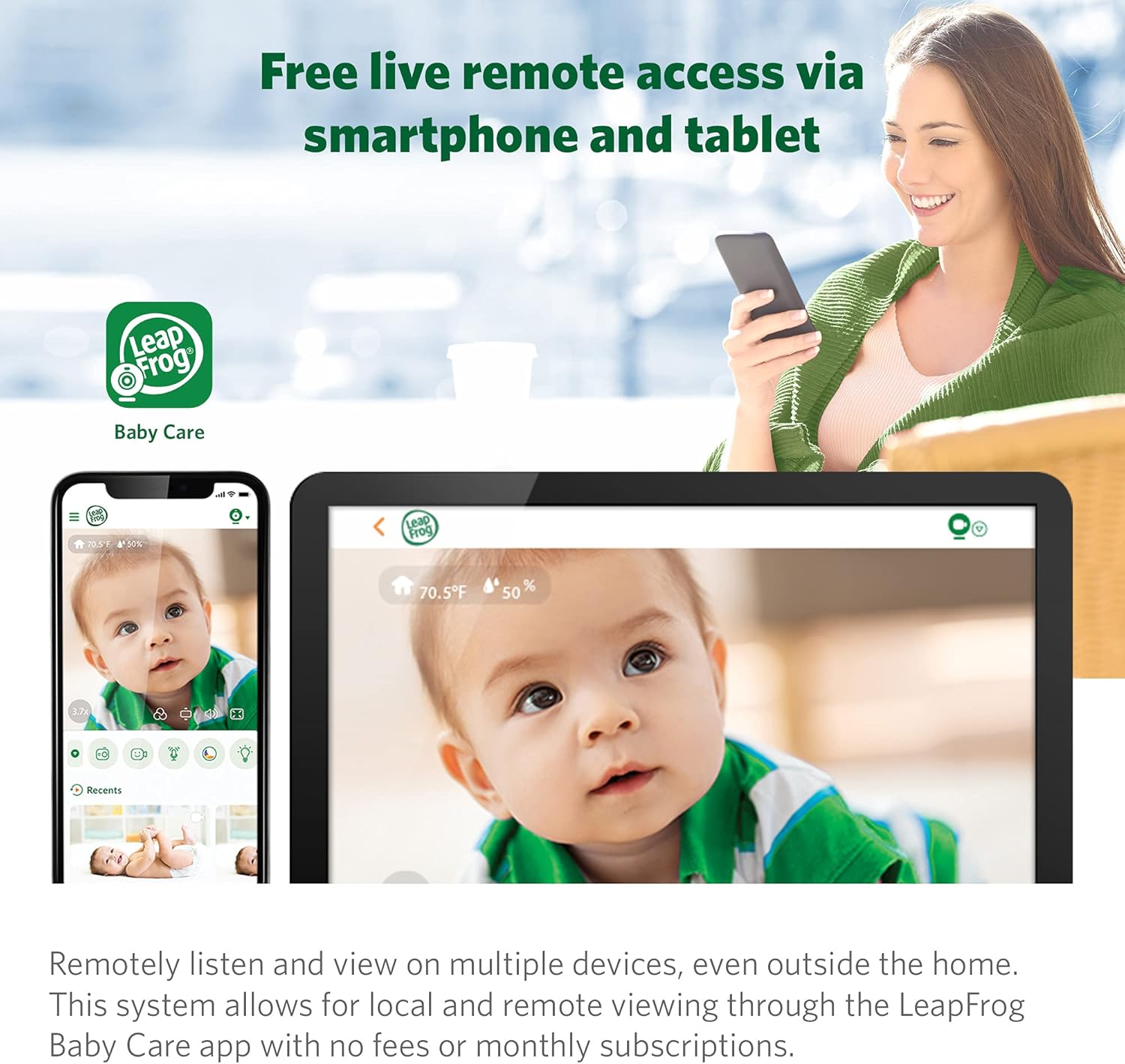 🐸【FREE LIVE REMOTE ACCESS VIA SMARTPHONE & TABLET】- Remotely listen and view on multiple devices, even outside the home. This system allows for local and remote viewing through the Leapfrog Baby Monitor app with no fees or monthly subscriptions.