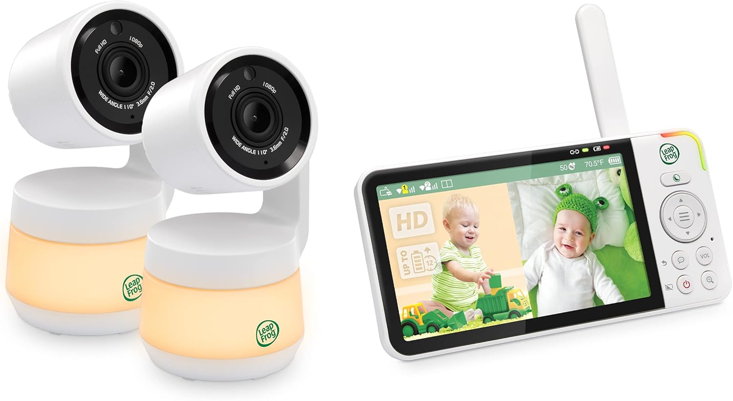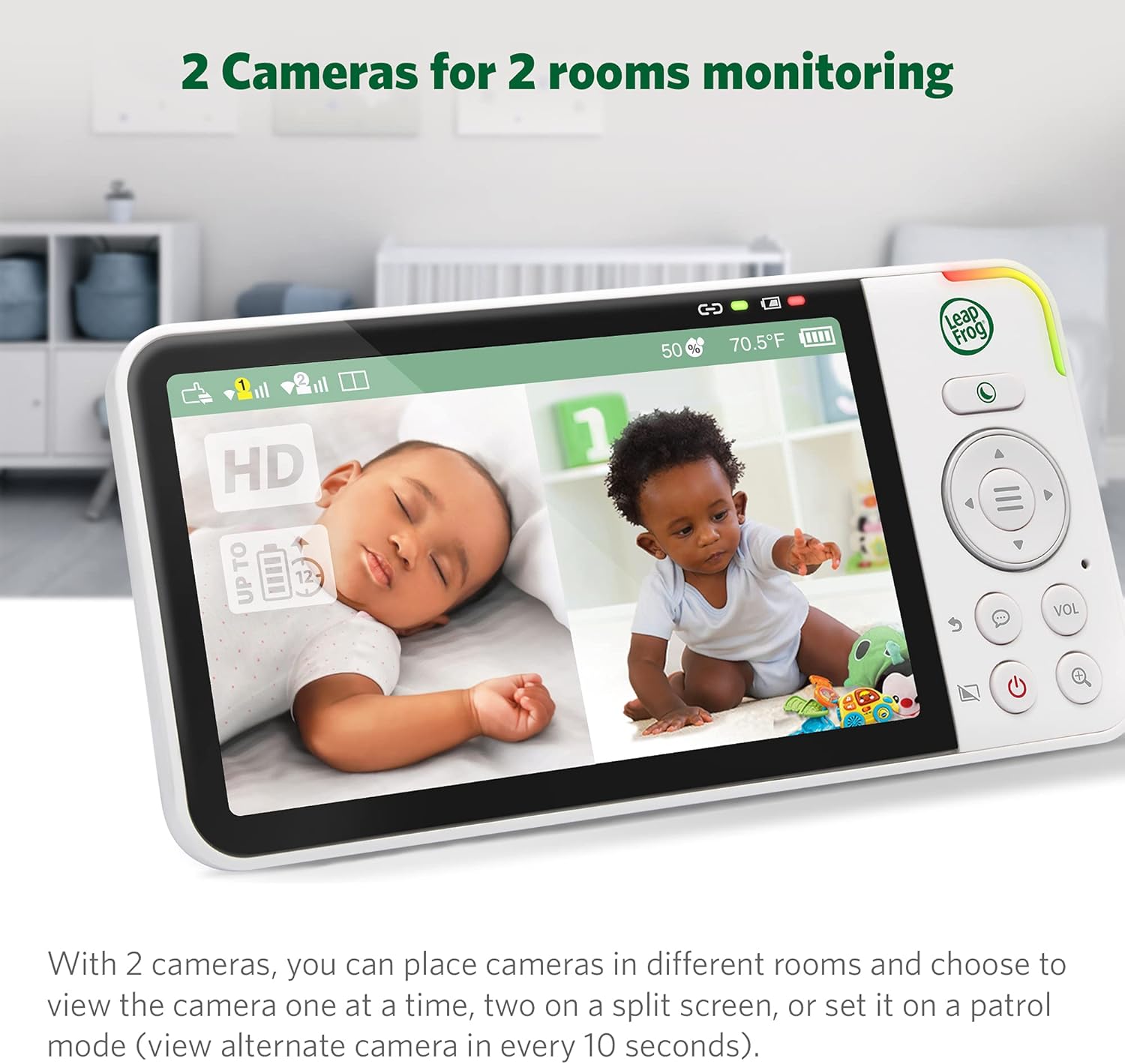 Watch over your little one at home on the 2 Camera 5-inch, 720p High-Definition LCD Parent Unit Display or remotely on your smartphone with the Leapfrog LF925-2HD WiFi video baby monitor. View rooms from top to bottom with the 152-degree vertical tilt angle and from side to side with the 360-degree horizontal pan capability. Enhance your baby’s sleep environment with a sound & light profile recommended by the experts at WeeSleep. Magnify details up to eight times their original size with the crisp digital zoom range and monitor room temperature and humidity levels directly from the Parent Unit Display. Plus, see your baby as clear as day, even in ultralow light, thanks to the automatic infrared Color Night Vision. Free professional in-app advice and videos provided by the experts at WeeSleep and LeapFrog help assist in the growth and development of your baby.