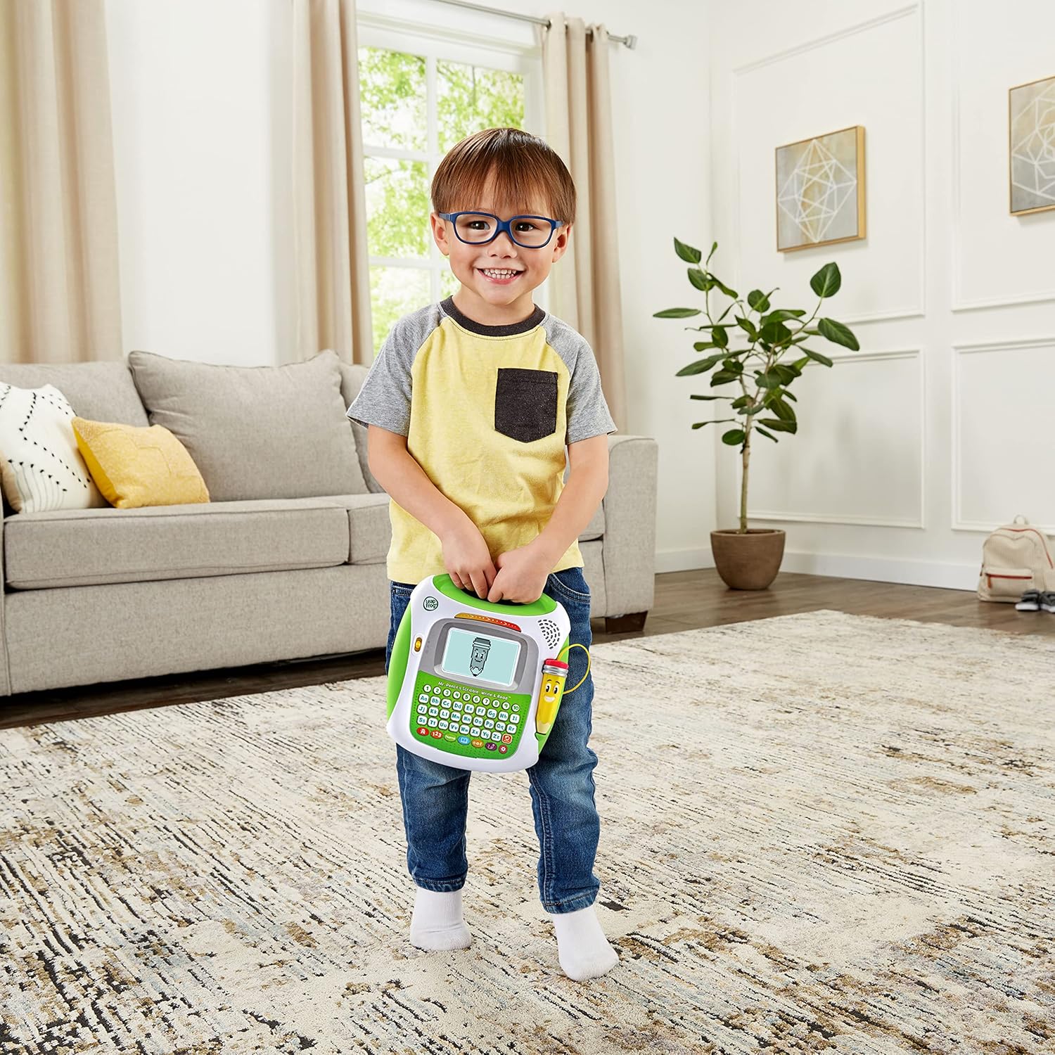 Play with a pal who has all the write stuff in the Mr. Pencil’s® Scribble, Write & Read™. Follow Mr. Pencil’s lead! Use the stylus and trace the dotted lines to write numbers, lowercase letters and uppercase letters. Then watch the letters transform into animated animals, objects and more. The numbers transform into objects that equal the number’s value. Tap Mr. Pencil® on them to count each one. Pencil perfect! Find letters to build words and explore early spelling skills. Complete a new word and sound it out. Slide Mr. Pencil® across the screen, and the bright lights of the sound-it-out bar follow along as you go. Add personalization by programming a child’s first, middle and last name. Kids can then practice writing the words they’re most familiar with—their name! Mr. Pencil® loves to draw. Watch him draw a picture using dotted lines and then trace over it. Kids can also follow their own creativity and free-draw anything they can imagine. That was fun, let’s play some more! Intended for ages 3+ years. Requires 3 AA batteries. Batteries included for demo purposes only. New batteries recommended for regular use.