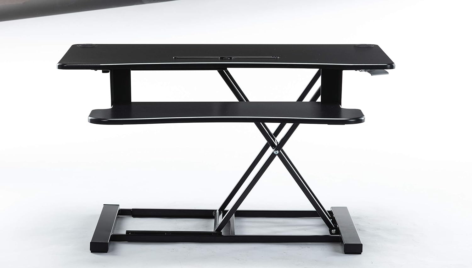 By using our workstation, you can upgrade your work experience finding the most comfortable and ergonomic balance between sitting and standing. You can extend and transform your current desk space by placing this dual tier height adjustable workstation to your office desk. Our workstation features a durable pneumatic spring that provides smooth transition, a height lock mechanism for perfect positioning, a large upper deck for dual monitor setups, and a preset hole with grommet for other installation options. Only minimal assembly is needed. Just simply attach the keyboard tray with the included screws and your new upgraded desk is all set! Say goodbye to long days of sitting at the office, ready to embrace your work day feeling energized and refreshed!