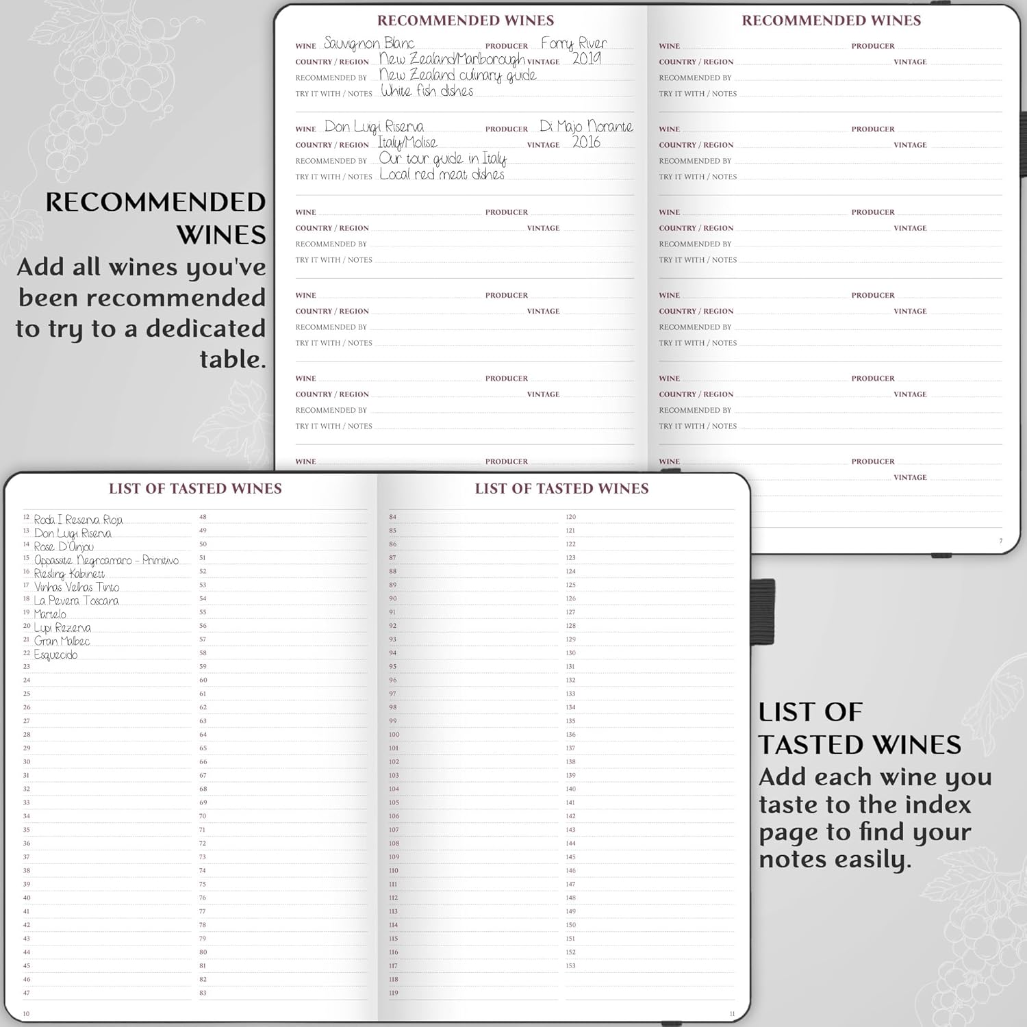WINE COLOR CARD, STICKERS & USER GUIDE – The wine notebook, sized at A5 (5.8×8.3”), has an eco-leather hardcover, thick 120gsm paper, pen loop, elastic band, and lay-flat binding. It comes with a wine color card, stickers, and user guide.