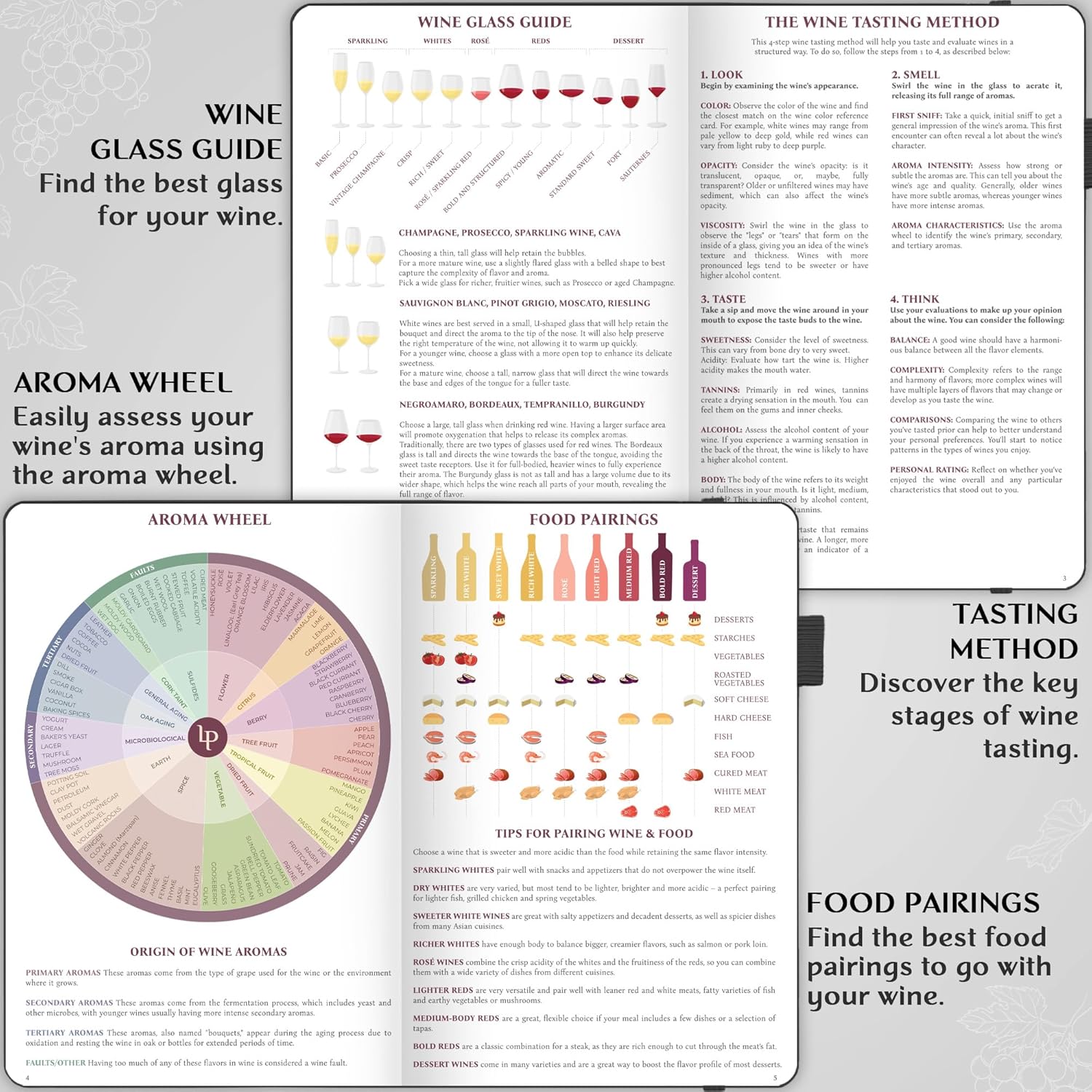 PERFECT FOR ALL LEVELS, INCLUDING BEGINNERS – Whatever your experience level, this wine journal notebook has all the tools you need to master wine tasting. Inside, you will find detailed instructions, an aroma wheel, a glass guide, and more.