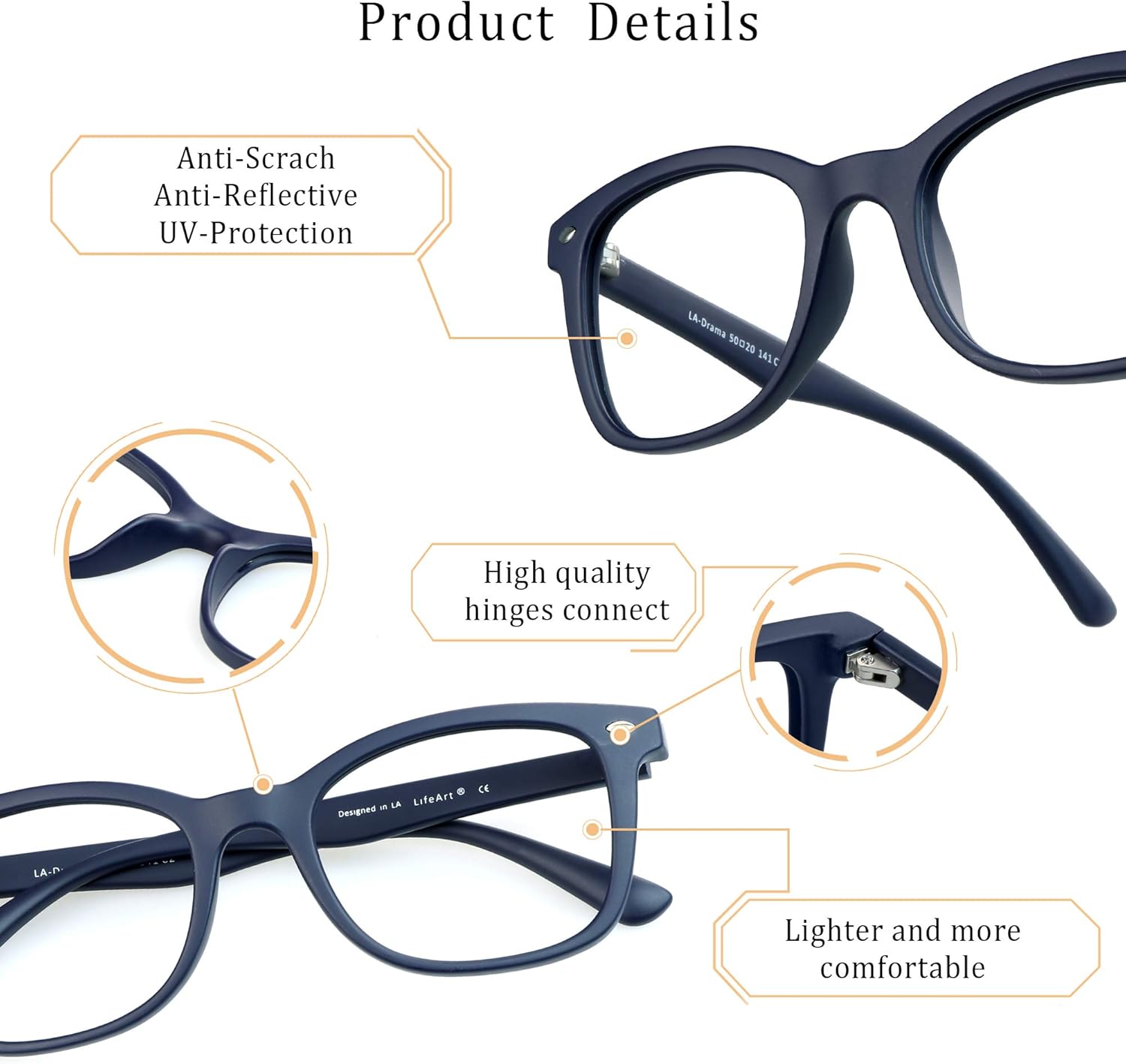 Enhance visual comfort with improved contrast & reduced eye strain Eliminates glare with premium AR and UV protection Ultra- light frame, stylish and comfort design Unisex glasses match different costume style, travel with fashion. Value pack with free eyeglasses case, cleaning cloth, small screwdriver, ear hooks, blue light blocking test kit included