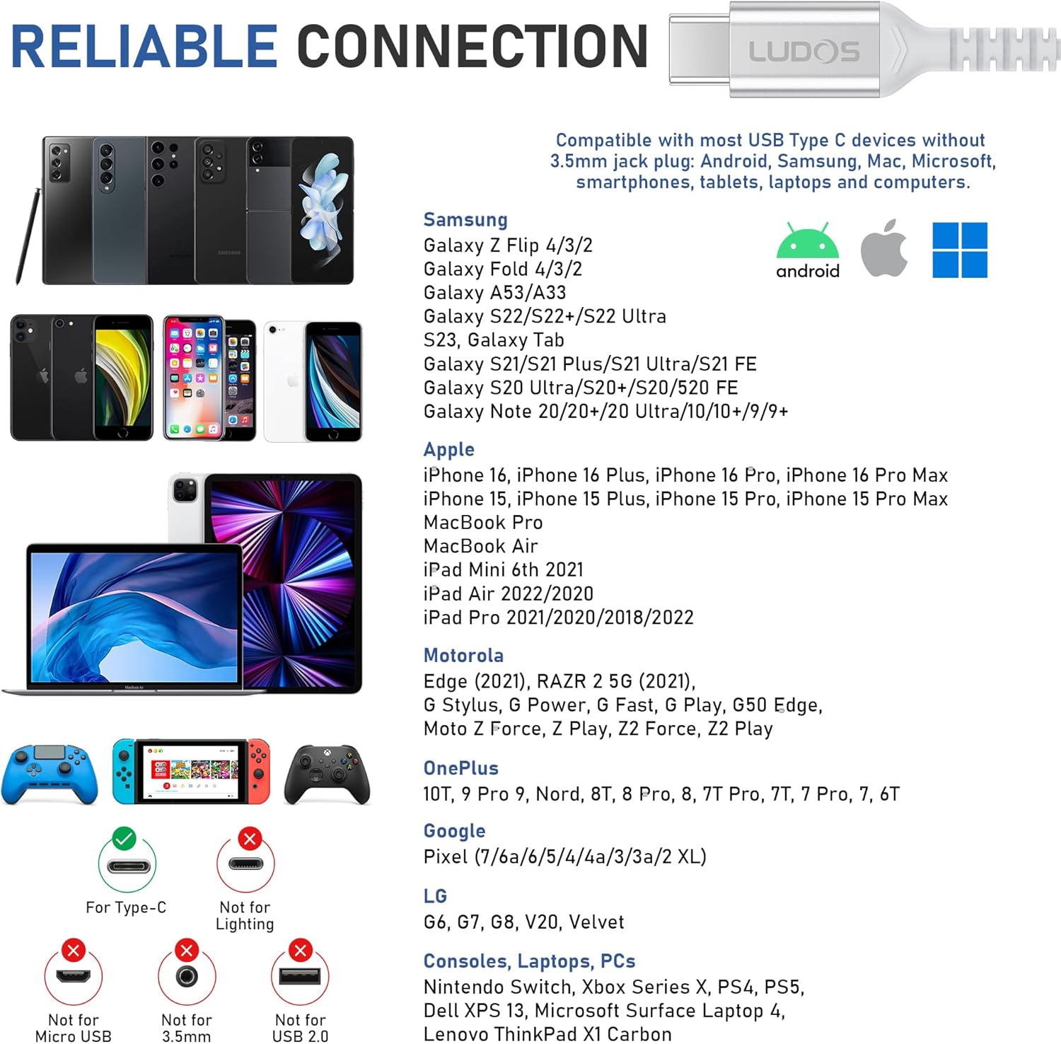SAMSUNG: Galaxy S24/S23/S22/S21/S21+/S21 Ultra/S21/S21 Ultra/S21 FE/S20/ Galaxy Tab S8/S7/S6/S5e, A53/A54/A33/A34 – GOOGLE Pixel 7/6a/6 PRO/6/5/4/4a — MOTOROLA Edge 2021 — LAPTOPS: DELL XPS 13, MICROSOFT Surface Laptop 4. And more devices without a 3.5mm jack port. We provide a 5-year warranty and our customer support is here to answer questions 24/7
