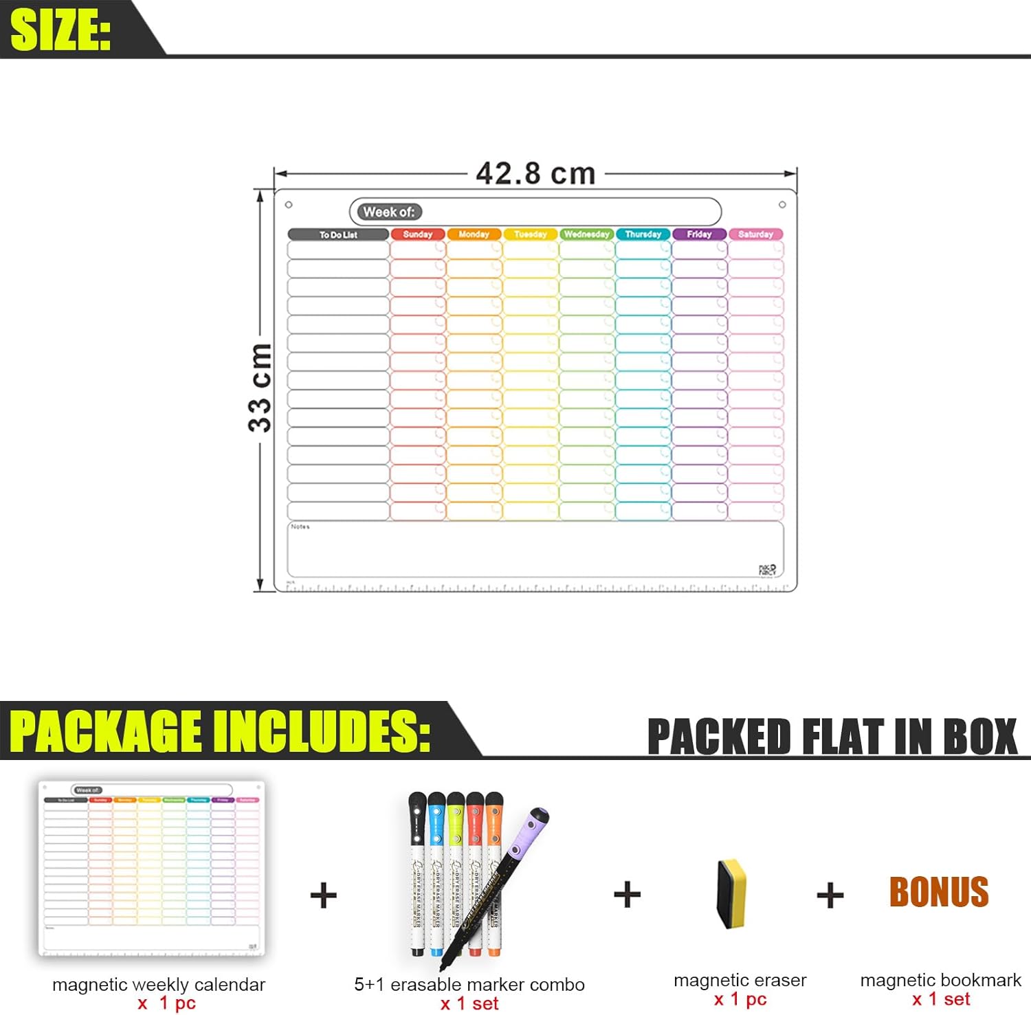 🎁GIFT IDEA!! – Flat packed in beautiful box! This magnetic dry erase calendar must be a great gift idea. The package includes: 1 Magnetic Weekly Planner (16.9″ W x 13″ H), 5 Dry Erase Markers, 1 Wet Erase Marker, 1 Eraser. Items are perfectly protected, SAY NO TO ROLL PACKING!!! Age grading: 3+ years – WARNING: CHOKING HAZARD-Small parts. Not for children under 3 years.