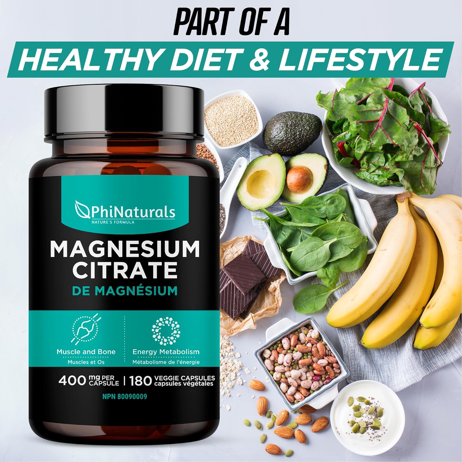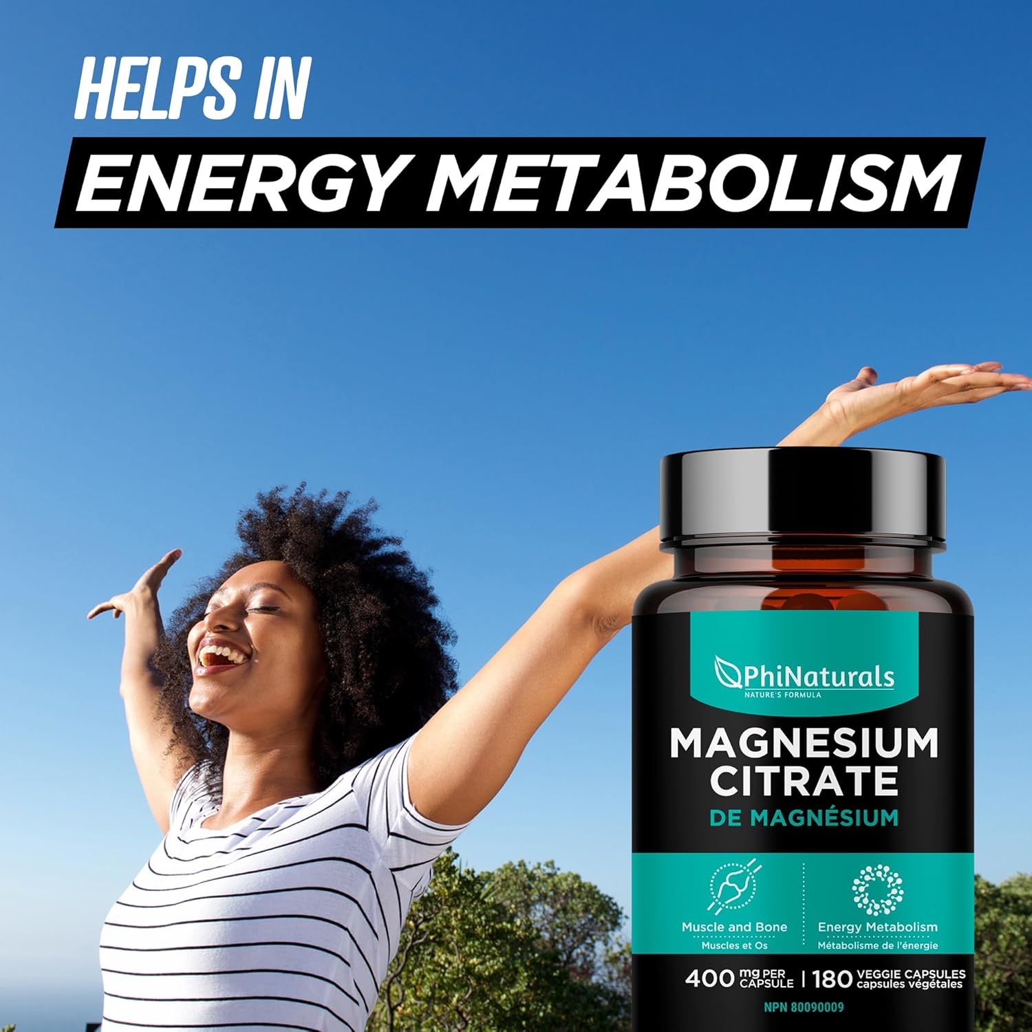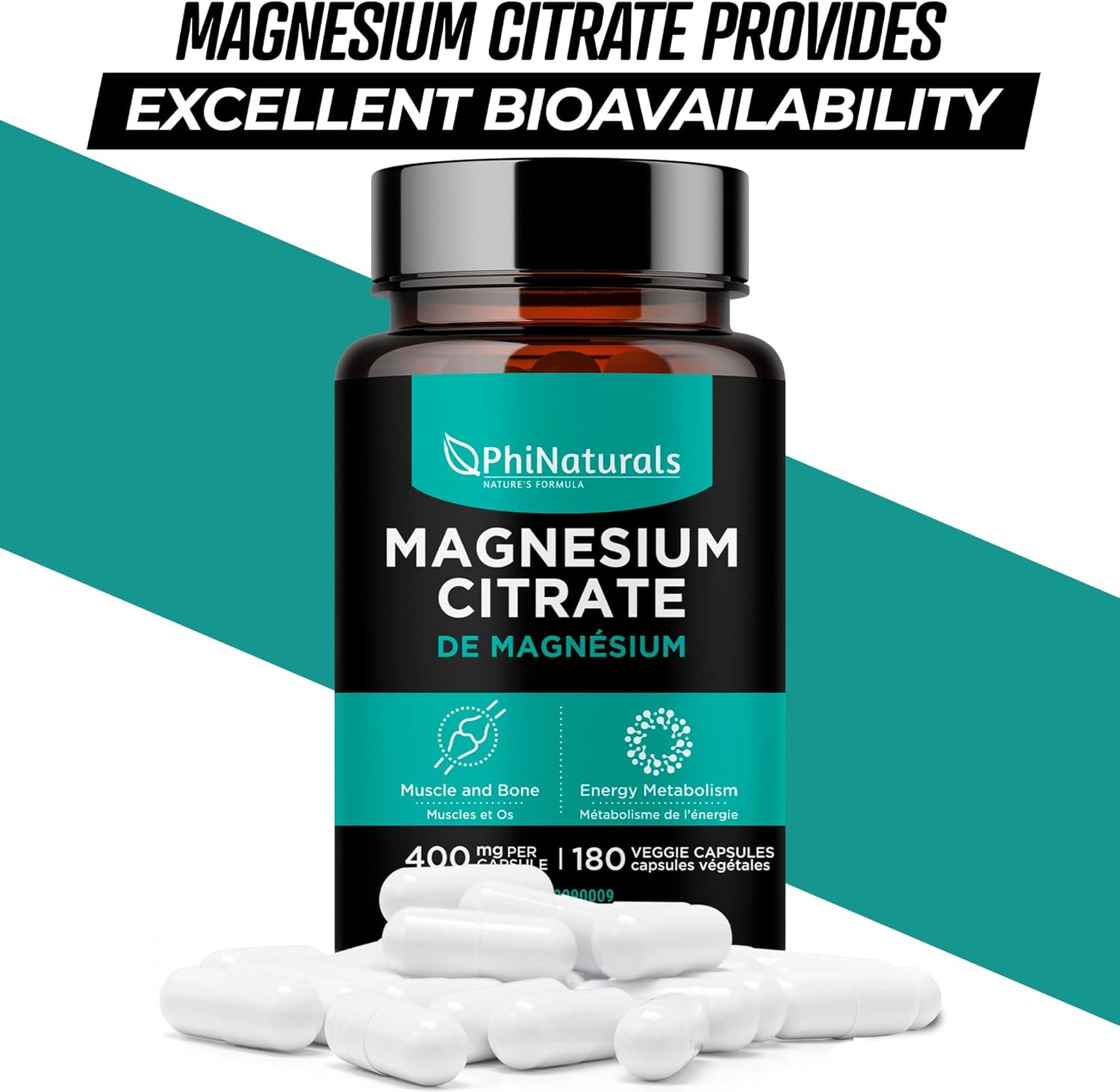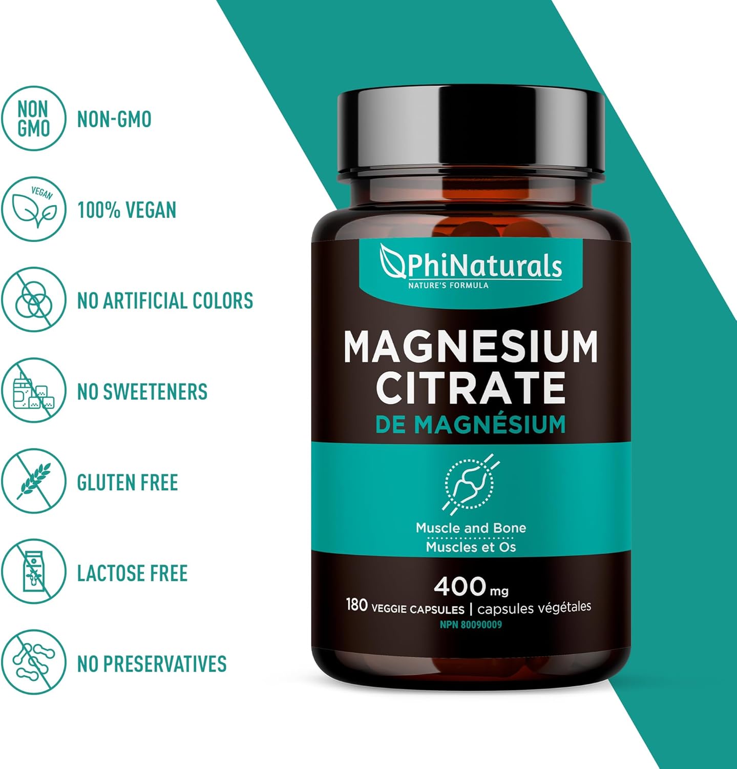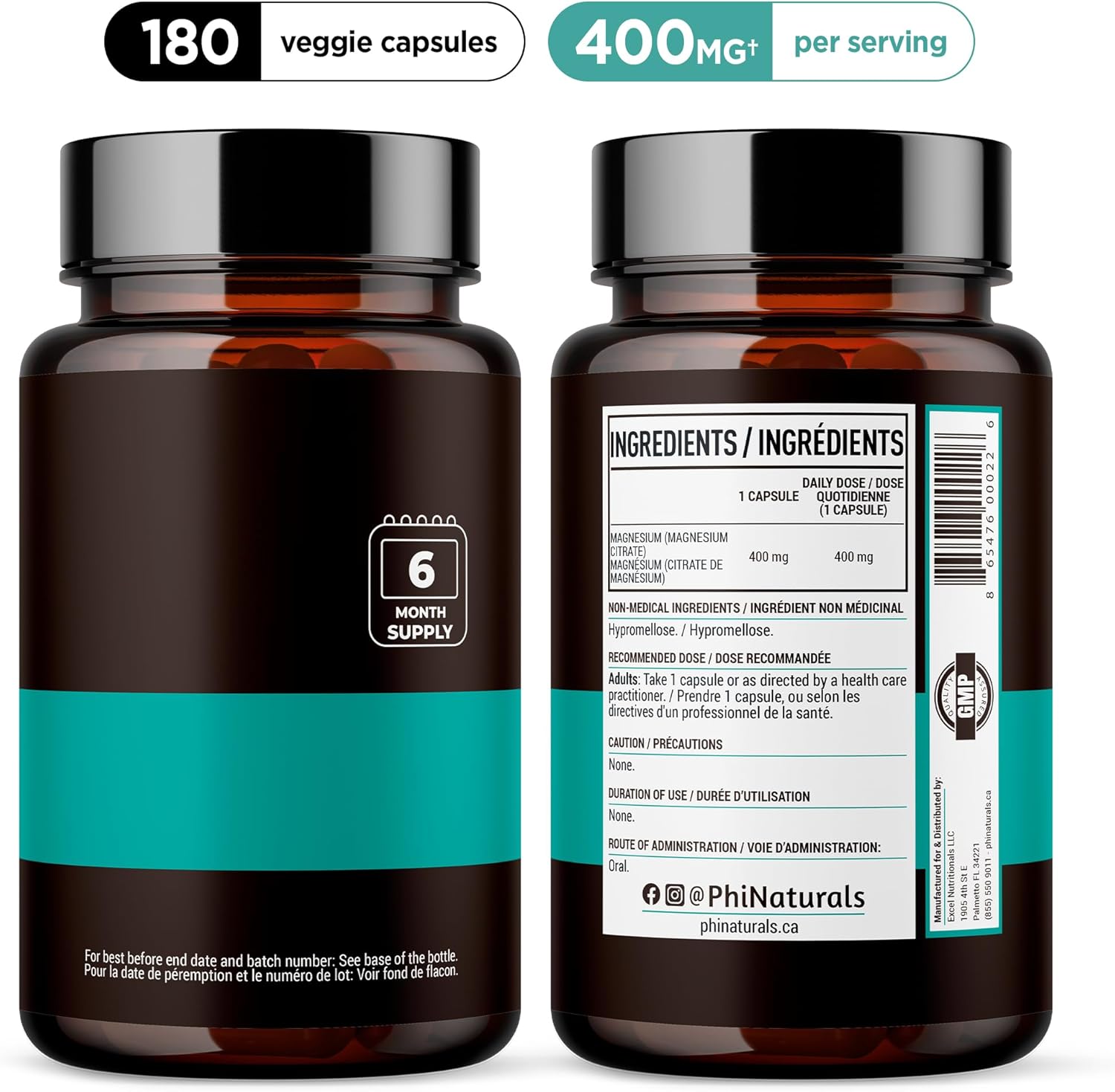 Magnesium by Phi Naturals contains 400mg of pure Magnesium Citrate per serving and 180 capsules.