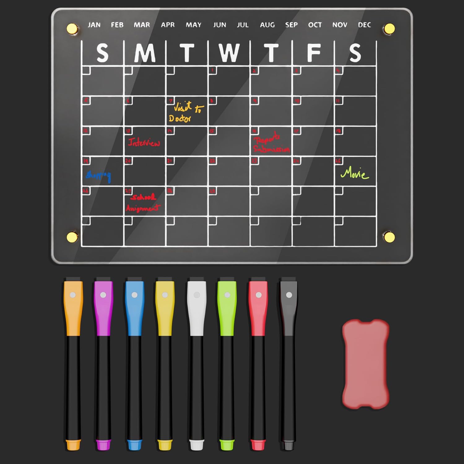 In today’s fast-paced world, staying organized is more important than ever. With so many commitments and events to juggle, a reliable and attractive organizational tool can make all the difference. Enter the Acrylic Magnetic Fridge Calendar with Gold Magnets—a perfect blend of functionality and elegance that transforms your kitchen or workspace into a hub of productivity and style. Sleek Design Meets Practicality Crafted from premium acrylic, this calendar exudes modern sophistication. Its clear surface not only provides a sleek aesthetic but also allows you to view your plans effortlessly. The minimalist design fits seamlessly into any décor, making it a stylish addition to your home or office. Whether your space is contemporary or traditional, this calendar serves as a functional piece of art. Magnetic Convenience for Everyday Use One of the standout features of our fridge calendar is its robust magnetic backing. This design allows it to securely adhere to any magnetic surface—be it your fridge, office whiteboard, or even a locker. The convenience of having your calendar at eye level means you can quickly glance at it to check your schedule without rummaging through papers or digital devices. No more forgetting important dates or double-booking appointments! Chic Gold Magnets for Added Elegance Our Acrylic Magnetic Fridge Calendar comes complete with exquisite gold magnets that elevate its visual appeal. These aren’t just ordinary magnets; they are designed to complement the sleek acrylic surface and add a touch of luxury to your organizational tools. Their unique design ensures that your calendar is not just functional but also a statement piece in your kitchen or workspace. Included Essentials for a Complete Experience Your purchase comes with everything you need to get started on your organizational journey: Magnetic Eraser: Say goodbye to messy notes and smudges! The included magnetic eraser allows you to effortlessly wipe away old entries, giving you a clean slate to work with. Its magnetic feature ensures that it stays within reach, eliminating the frustration of misplaced erasers. High-Quality Markers: Our set of vibrant, high-quality markers is designed specifically for use on acrylic surfaces. These markers glide smoothly and dry quickly, ensuring that your notes are clear and easy to read. With assorted colors, you can color-code your entries for even better organization. Versatile Use for Everyone This calendar is not just for busy professionals; it’s designed for anyone looking to streamline their lives. Here are some practical applications: Family Planning: Keep everyone in the loop by tracking family activities, from school events to family outings. Use different colors for each family member to make it easy to identify who’s doing what. Meal Planning: Write down your weekly meal plans and grocery lists. This not only simplifies your shopping but also helps reduce food waste by ensuring you use up what you buy. Goal Tracking: Set personal or professional goals and track your progress visually. This calendar helps you stay motivated and accountable by providing a constant reminder of your objectives. Event Reminders: Use it as a reminder system for birthdays, anniversaries, or important deadlines. With your schedule visible at all times, you can ensure that you never miss an important date. Durability and Easy Maintenance Our acrylic surface is not only stylish but also highly durable. Designed to withstand daily use, it will retain its pristine appearance for years. Maintenance is a breeze—simply wipe it clean with a damp cloth to remove old notes and marks. This reusable calendar is an eco-friendly option that eliminates the need for paper planners and sticky notes, making it a sustainable choice for the environmentally conscious consumer. The Perfect Gift for Any Occasion Looking for a thoughtful gift for a friend, family member, or colleague? The Acrylic Magnetic Fridge Calendar is an ideal choice! Its combination of style and practicality makes it suitable for various occasions, from housewarmings to birthdays and holidays. Help your loved ones take control of their schedules with a gift that promotes organization and elegance. It’s a present that shows you care about their well-being and success. Satisfaction Guaranteed We take pride in the quality of our products and are committed to ensuring your satisfaction. If for any reason you’re not completely happy with your Acrylic Magnetic Fridge Calendar, please don’t hesitate to reach out to us. We’ll work with you to address any concerns and make sure you are delighted with your purchase. Dimensions and Specifications Size: 16″ x 12″ – Ideal for a variety of spaces, striking the perfect balance between visibility and compactness. Material: Made from high-quality acrylic for durability and a sleek finish that is easy to maintain. Included: 1 acrylic calendar, 1 magnetic eraser, and 4 vibrant markers in assorted colors to enhance your organizing experience. Join the Organization Revolution Incorporating the Acrylic Magnetic Fridge Calendar into your daily routine is a game changer. It empowers you to take control of your time and commitments while adding a touch of elegance to your environment. Say goodbye to chaos and hello to a beautifully organized life. Make the smart choice today and invest in the Acrylic Magnetic Fridge Calendar with Gold Magnets. Click “Add to Cart” now and embark on your journey toward a more structured and stylish life. Enjoy the benefits of effective planning and the satisfaction of a tidy, well-organized space. Your future self will thank you! Whether you’re managing a busy family, planning meals, or setting personal goals, this calendar will quickly become an indispensable part of your routine. Don’t miss out on this opportunity to elevate your organization game—order yours today and experience the difference!