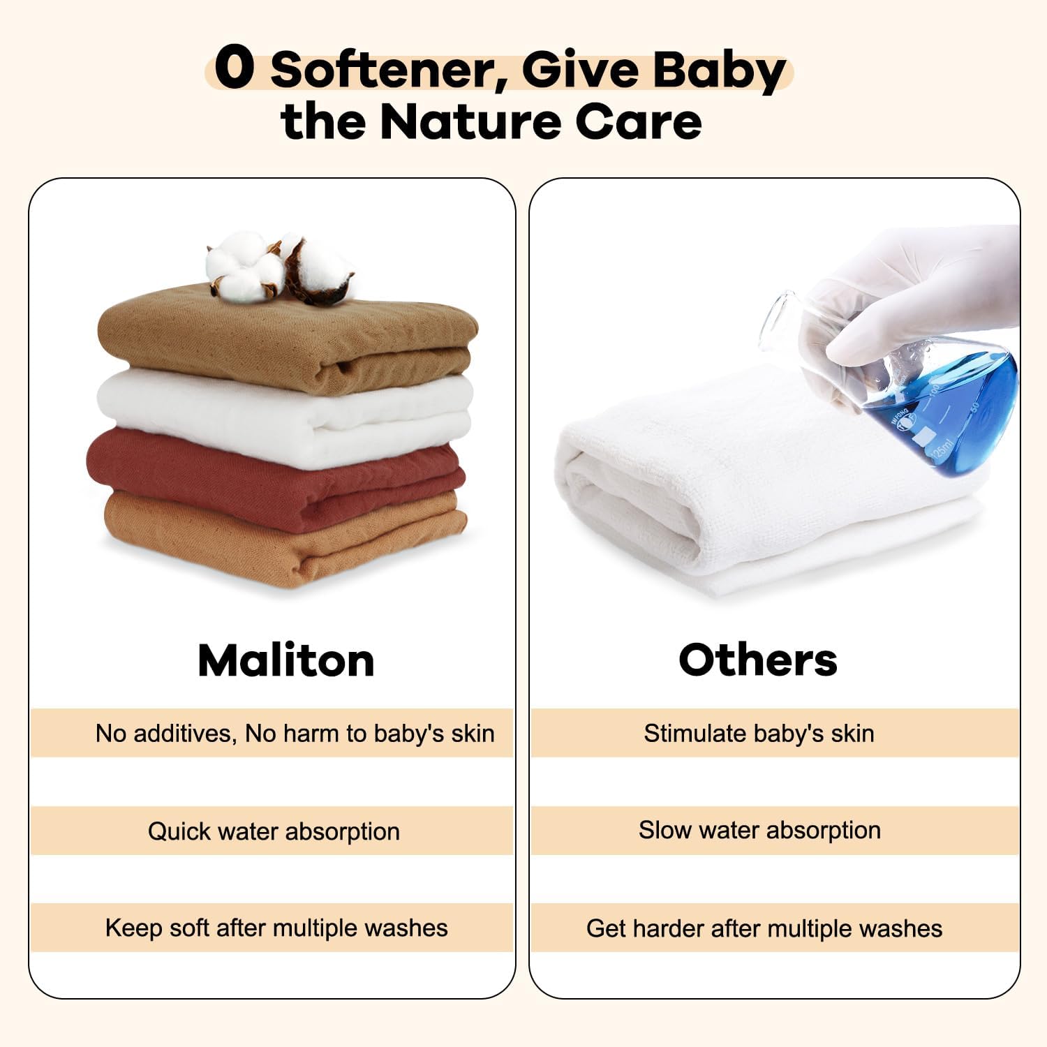 Soft: Softness is more important if you’re wiping the area of baby is sensitve; Made with combed cotton process on outer layer, bringing a softer touch to baby; Without the softener, Maliton burp cloths not easy to stimulate baby’s skin and give the baby nature care