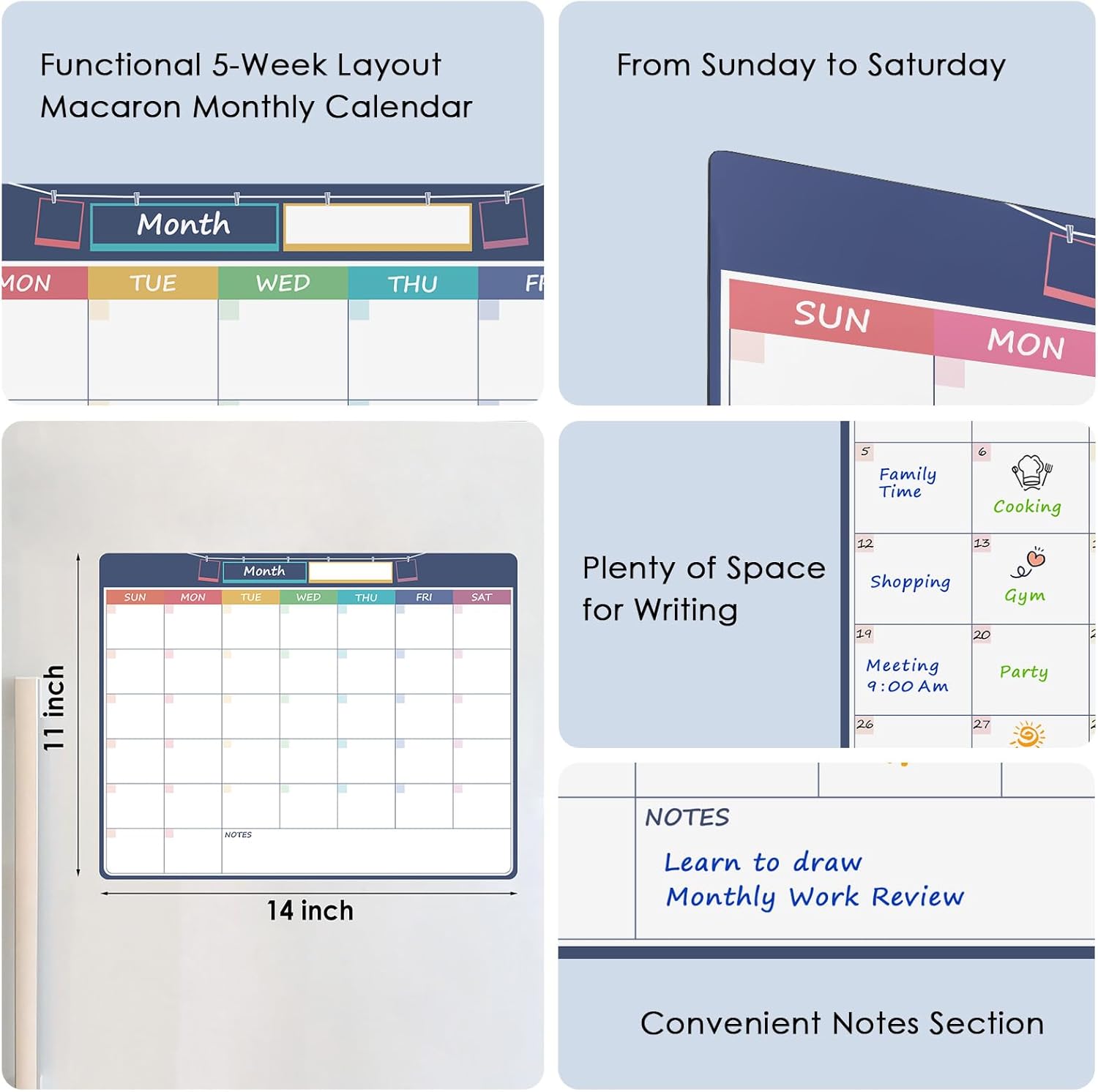 The monthly whiteboard calendar is made of soft and flexible PET material with strong magnet on the backing to allow zero movement of the calendar and keep them from falling down and sliding on any metal smooth surface. Perfect for Writing & Erasing your monthly plan.Organize your daily life well. Our magnetic meal planner is designed with the highest standard of stain resistant technology that can be easily clean even after more than 6 months without leaving any stain and ghosting. Perfect for planning/scheduling your daily/weekly/monthly life, creative meal planner /dinner/weight-loss eating plan diet, work, workouts, monthly menu board for kitchen, reminder board, to do list board, noteboard, etc. Smooth, dry-erase surfaces let you wipe old notes and write ones in seconds. Use the eraser to clean up and the markers to write new reminders and lists. Your menu whiteboard is perfect for the fridge with plenty of space to fit all your daily meals, grocery lists, and notes. Having the monthly magnetic white board on the fridge makes it so much easier for everyone to see what’s going on and when. Perfect for busy people to create their weekly plans such as daily tasks, every event & date, to-do list, shopping list, and so on. Planning ahead and improving your productivity is easy with this simple design fridge calendar whiteboard (11″ x 14″)! All of your plans, ideas, appointments and important events at a glance! All your plans, ideas, meetings, appointments and important events at a glance! If you have any questions, please contact us and we will reply within 12 hours.