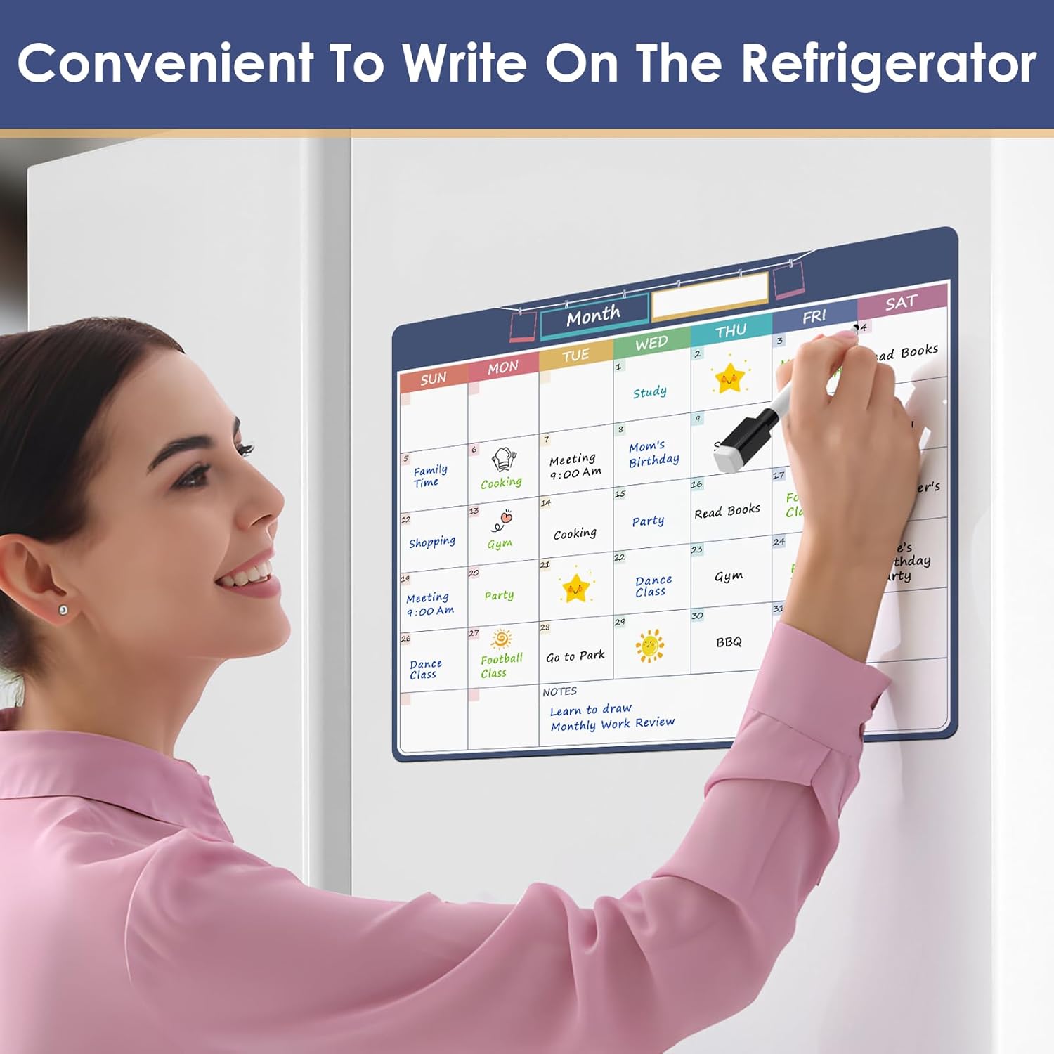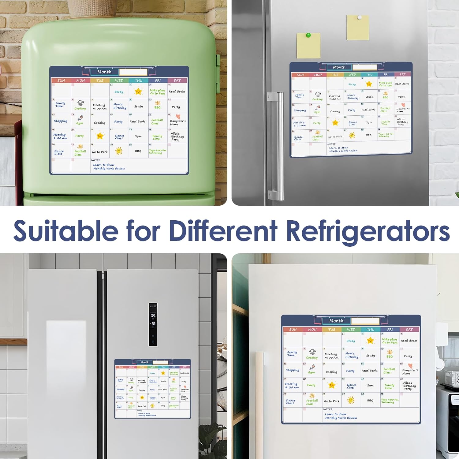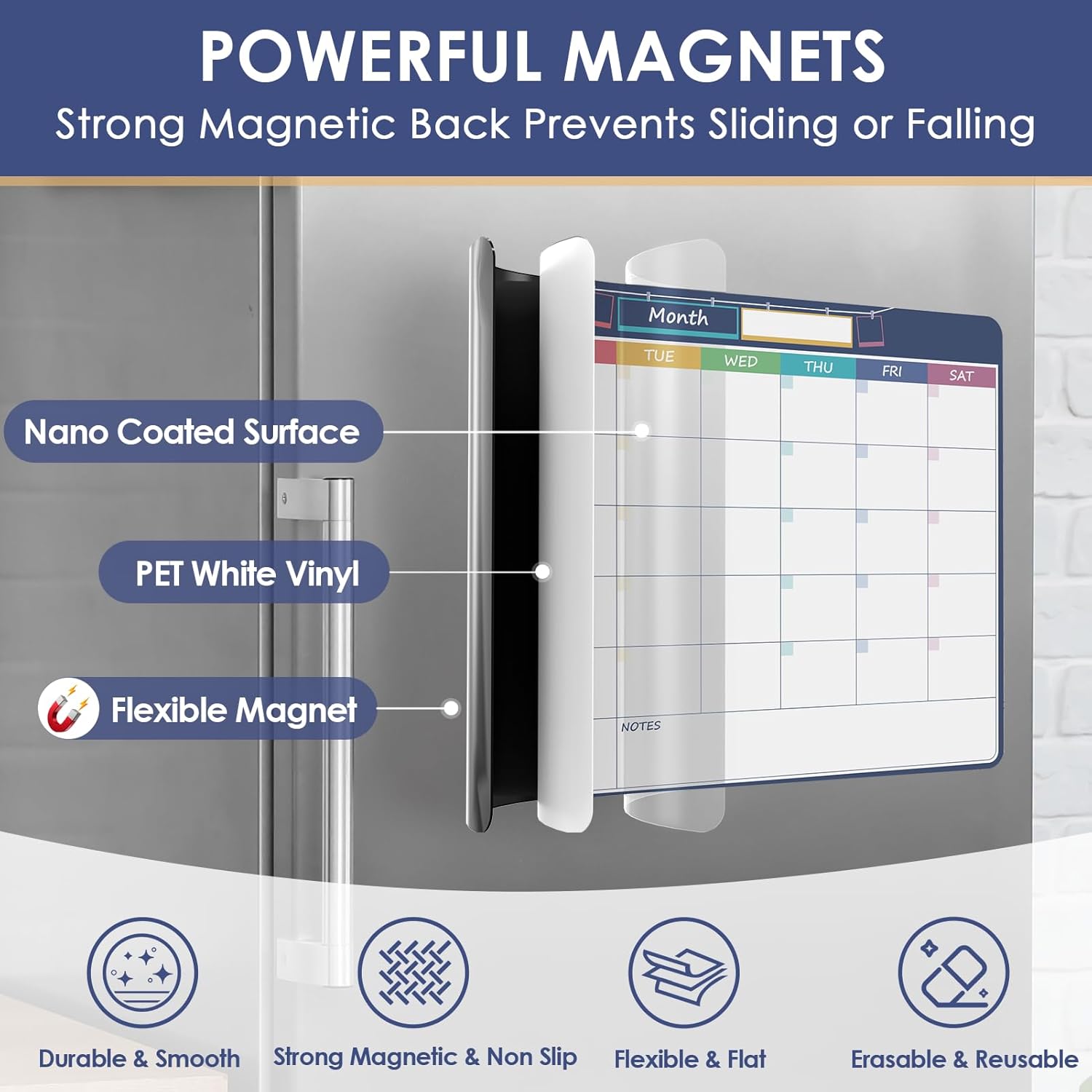 Strong Magnet and Non-Slip: The monthly whiteboard calendar is made of soft and flexible PET material with strong magnet on the backing to allow zero movement of the calendar and keep them from falling down and sliding on any metal smooth surface. Perfect for Writing & Erasing your monthly plan.Organize your daily life well.