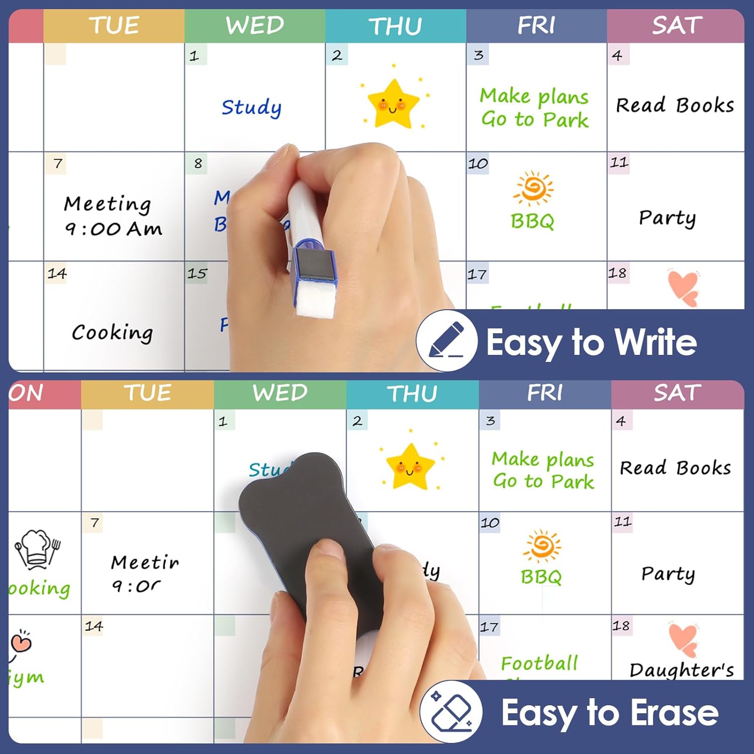 Reusable & Easy to Clean Calendar Board: Smooth, dry-erase surfaces let you wipe old notes and write ones in seconds. Use the eraser to clean up and the markers to write new reminders and lists.