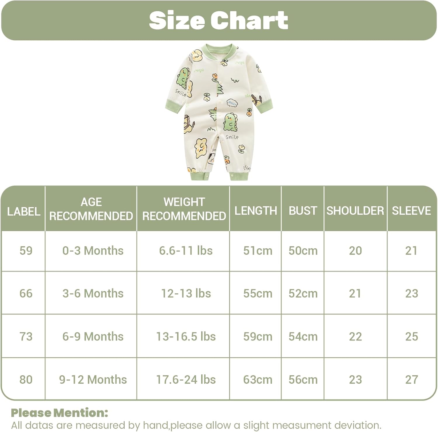 EL pijama está muy bien. para la talla de 9 a 12 meses mide de largo sin estirarla: 62,5 cm.Todo muy bien, la tela, la textura.El único inconveniente es que no tapa los pies (pero eso ya se sabe cuando se compra y se ven las imagenes).Llego en 5 días (lo estipulado) y bien embalado.Un saludo