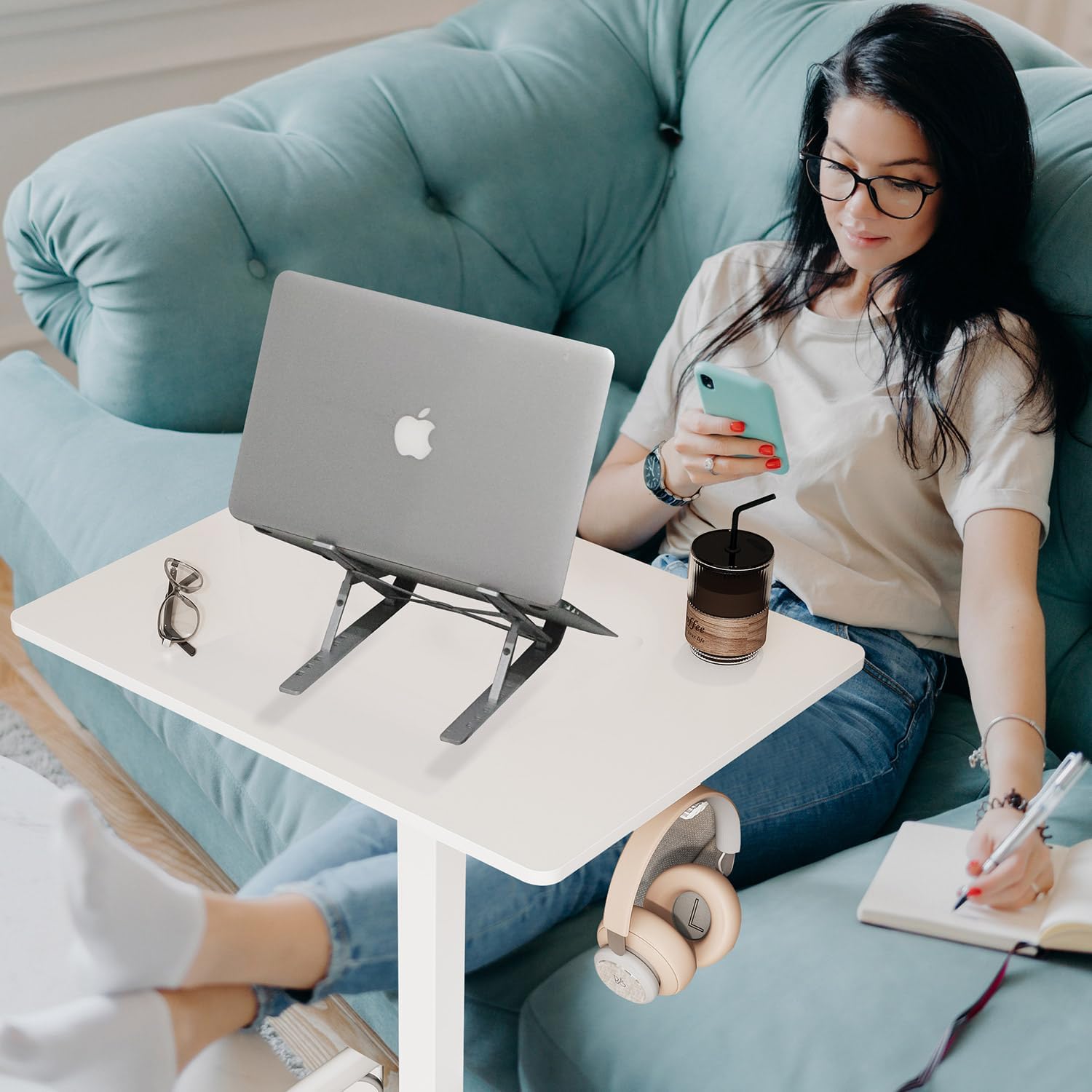 This rolling adjustable height desk is a game-changer for my home office setup! I’m incorporating it into my home studio setup (in progress) with the a laptop and headphones in the room’s diagonal corner wall, next to the keyboard. A very appreciated feature is the included headphone hook to one side on the underside of the tabletop.One of the best features is the ability to switch between sitting and standing modes effortlessly. The height adjusts anywhere between 28.5” to 42.5” with just a light push, making it easy to alternate between sitting and standing throughout the day, which has been fantastic for my posture.The desk is incredibly mobile thanks to its four silent wheels. It moves smoothly and quietly across my floor, and when I need it stationary, I can lock two of the wheels in place, keeping it secure. The wheels make it super easy to move around and set up wherever I need to.It’s also very sturdy and well-made. The steel H-shaped base gives it excellent stability, and the desk surface is durable and easy to clean, which is a nice bonus. Despite its portability, it can hold up to 50 lbs, so I can easily store my laptop, a few books, and some accessories on it without worry. Another nice included the option is the collapsible laptop stand (in use)!Assembly was straightforward, and the included instructions and video were clear, making it easy to set up in no time. I highly recommend this desk to anyone looking for a flexible, ergonomic workstation that’s easy to move and adjust. It’s perfect for working from home or just creating a more comfortable workspace!