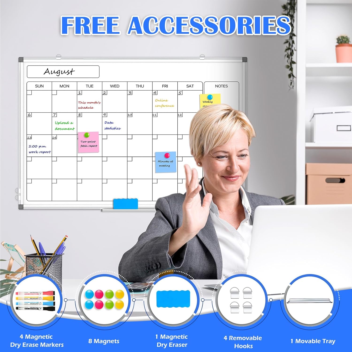【Double-Sided Calendar White Board】: Our monthly whiteboard can put your life in order and plan ahead. Magnetic dry erase calendar board is perfect for pinning notes, messages, pictures, memos, calendars, menus, reminders and more. The magnetic double-sided whiteboard allows you to have two projects going. The other sided is blank. It is the best tool for home teaching or memo.