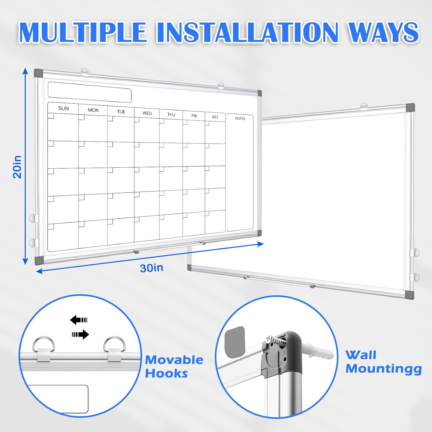Monthly Calendar Dry Erase Whiteboard for Wall, 30″ x 20″ Double-Sided Large Calendar White Board, Magnetic Portable Hanging Board for Office, Home, School