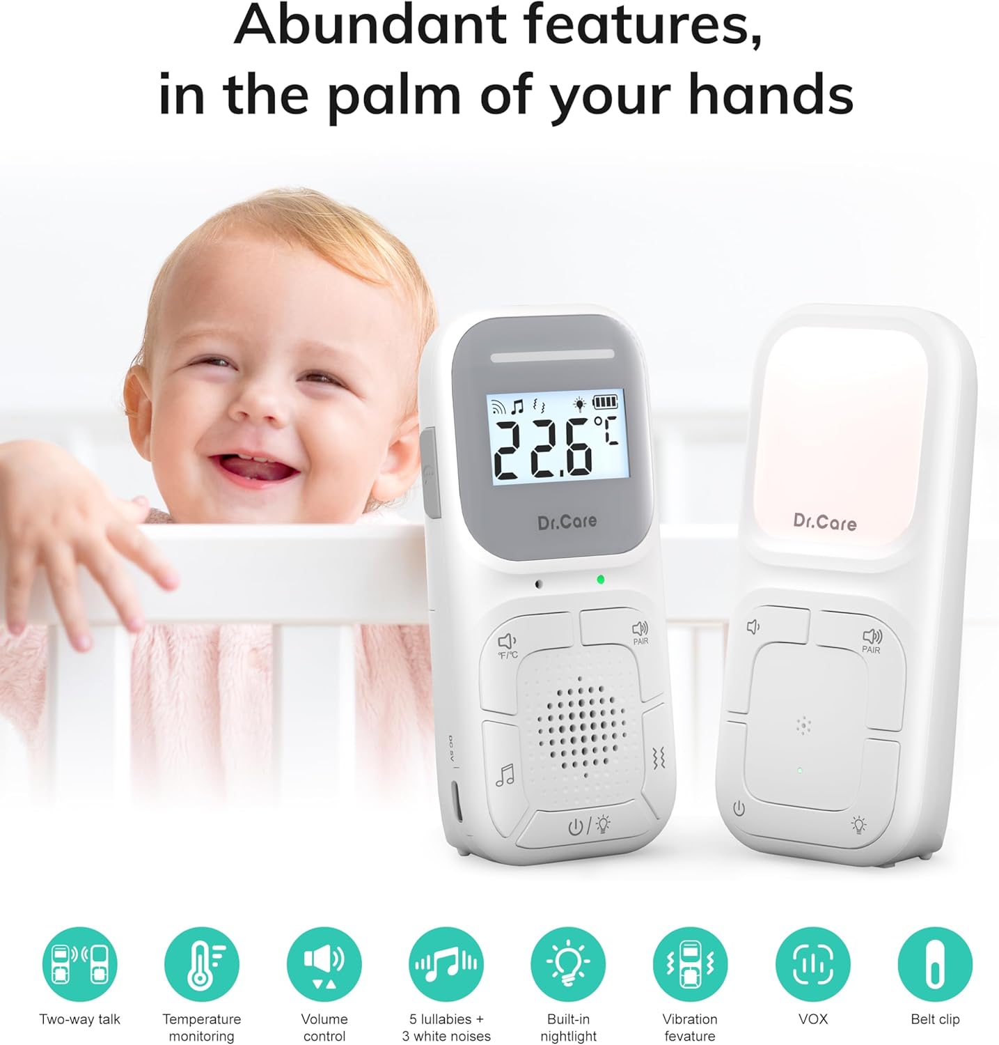 What You Get: At Dr. Care, we help every parent embrace the joy of parenthood without sacrificing your personal time. Package Contents: Dr. Care Neo baby audio monitor parent unit x1, baby unit x1, Charging cable x2, power adapter x1, user manual x1. Enjoy a 1-year quality warranty with an additional 6-month warranty upon registration, plus 24/7 customer support.