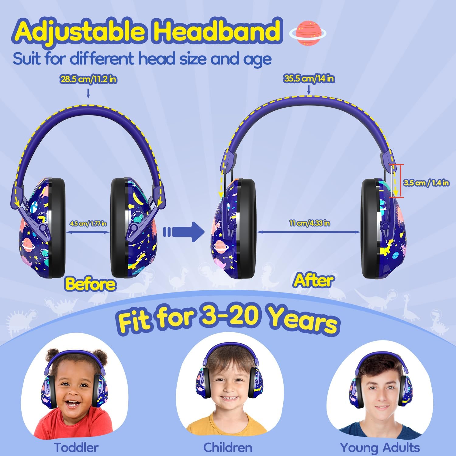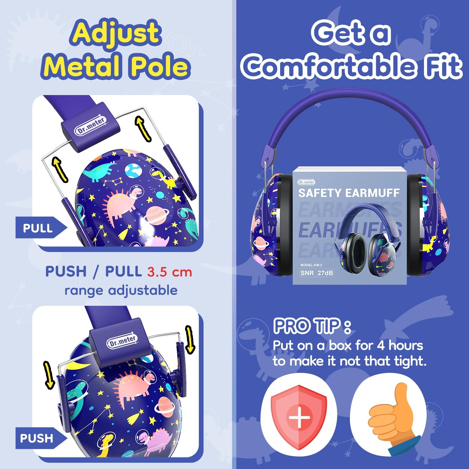 【Adjustable Headband】Say goodbye to ill-fitting earmuffs with Dr. Meter’s adjustable headband. The metal brackets on both sides can be easily pulled or retracted to fit any head size, ensuring a comfortable and secure fit for every child. These lightweight earmuffs also come with 360° rotating ear cups, making them easy to store and carry around.