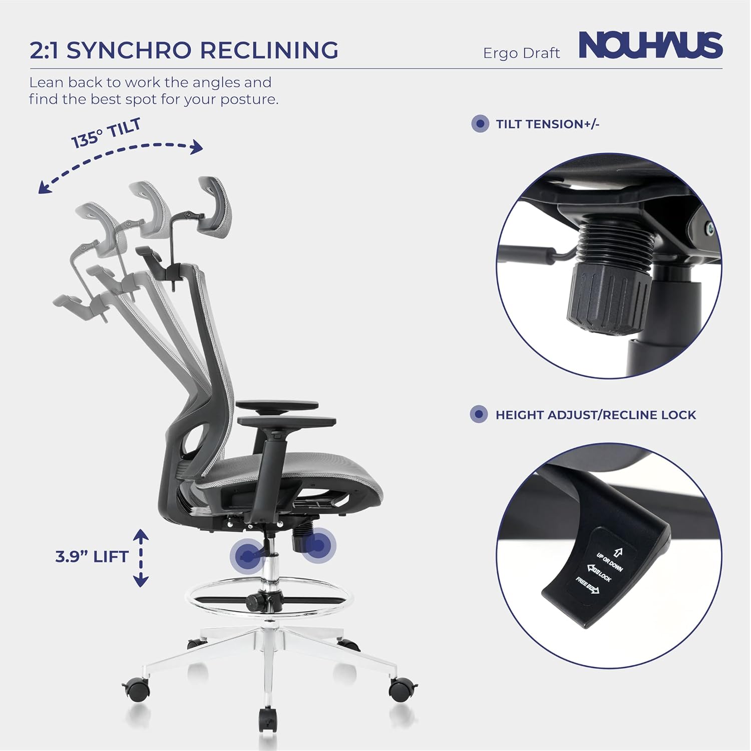 Since I’m a designer, photographer and writer, after the morning’s workout, I sit at the MacBook Pro at a high desk. After a year of using a standard higher than normal kitchen table chair, my back was killing me. Although I wasn’t interested in paying over $200 for a chair, reviews for most inexpensive chairs were not recommending for over a couple of hours of sitting. Thankfully I took the chance on the NOUHAUS ErgoDraft chair and it’s the most comfortable chair I’ve sat in for work. Even after a long day. It’s easily adjustable, quality of the webbing has been great and for my 185 lb frame, everything stays at the level I set. No readjusting the height at all. Although, when it arrived, the box looked beat up, everything was fine inside. The instructions were clear and it took less than 20 minutes to put together because I was slow and methodical. One thing I noticed while putting it together was how well the pieces were made, and that was encouraging. The only complaint, and it’s small, that I have is the way the foot ring is secured to the post. It’s a little kludgy and doesn’t stay tight for long. So, for me, it just wobbles and moves around. Thankfully, it’s at its lowest setting so that doesn’t bother me. Great purchase. Great product. I approve.