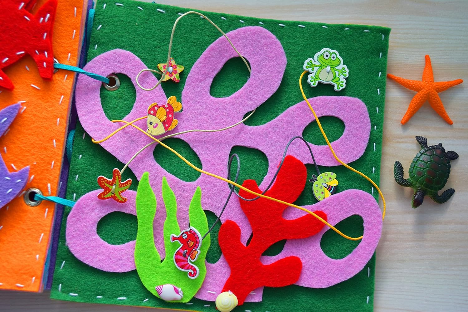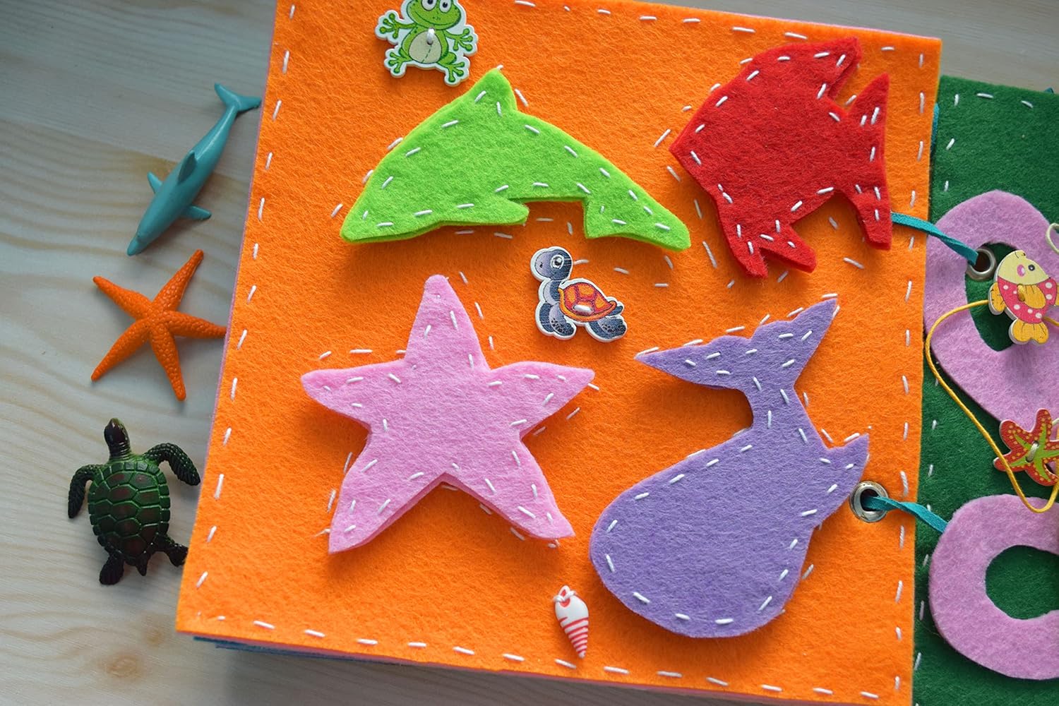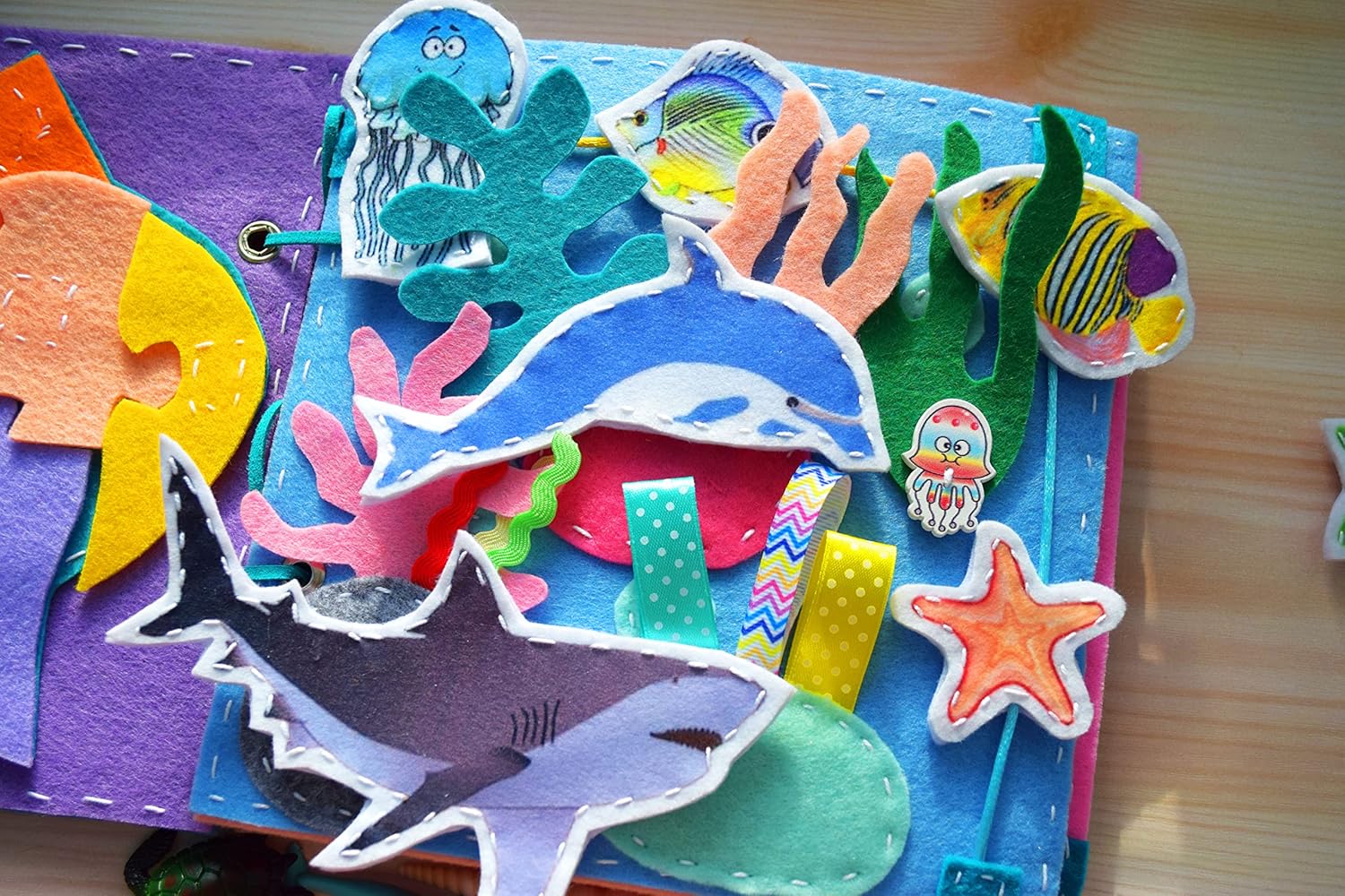 ♥ ♥ Ocean Busy book with a magnetic sea animals – 8 games in 1 book – educational toy for baby! ♥ ♥ A gentle book of a felt is an educational toy. It is also called a quiet book. All sea animals are with magnets so baby can put any dino in different place with magnets. Also the baby earns colors, the toy develops memory, develops finger motility, teaches role games, develops attentiveness and ingenuity. The child can play with the book while traveling, by himself or with his mother, sisters, brothers. The toy has many kinds of a fasteners: buttons (knob fasteners), velcro tape. This toy is made by hands. All pages and details of the book are very soft to the touch. There is many wooden buttons with pictures in the book. Also mom can helps her child create a new details for this toy. The book has 8 educational pages. All pages are multicolored and bright. You can clean this book by hands, with a soap for if necessary. Gently rub the dirty place with soap and water, rinse with clean water. Size: 20 x 20 cm / 7.86 inches x 7.86 inches. 1 page. Animals in the ocean. 2 page. Felt puzzle – Fish. 3 page. Animals in the ocean. 4 page. Accounting from 1 to 5. 5 page. Octopus – space and spy bag game. A different buttons have been secured inside this felt bag with a window to seek and find. 6 page. Contours. Colors. 7 page. A fishes and animals in the coral reef. Put through hole. 8 page. A maze (labyrinth).