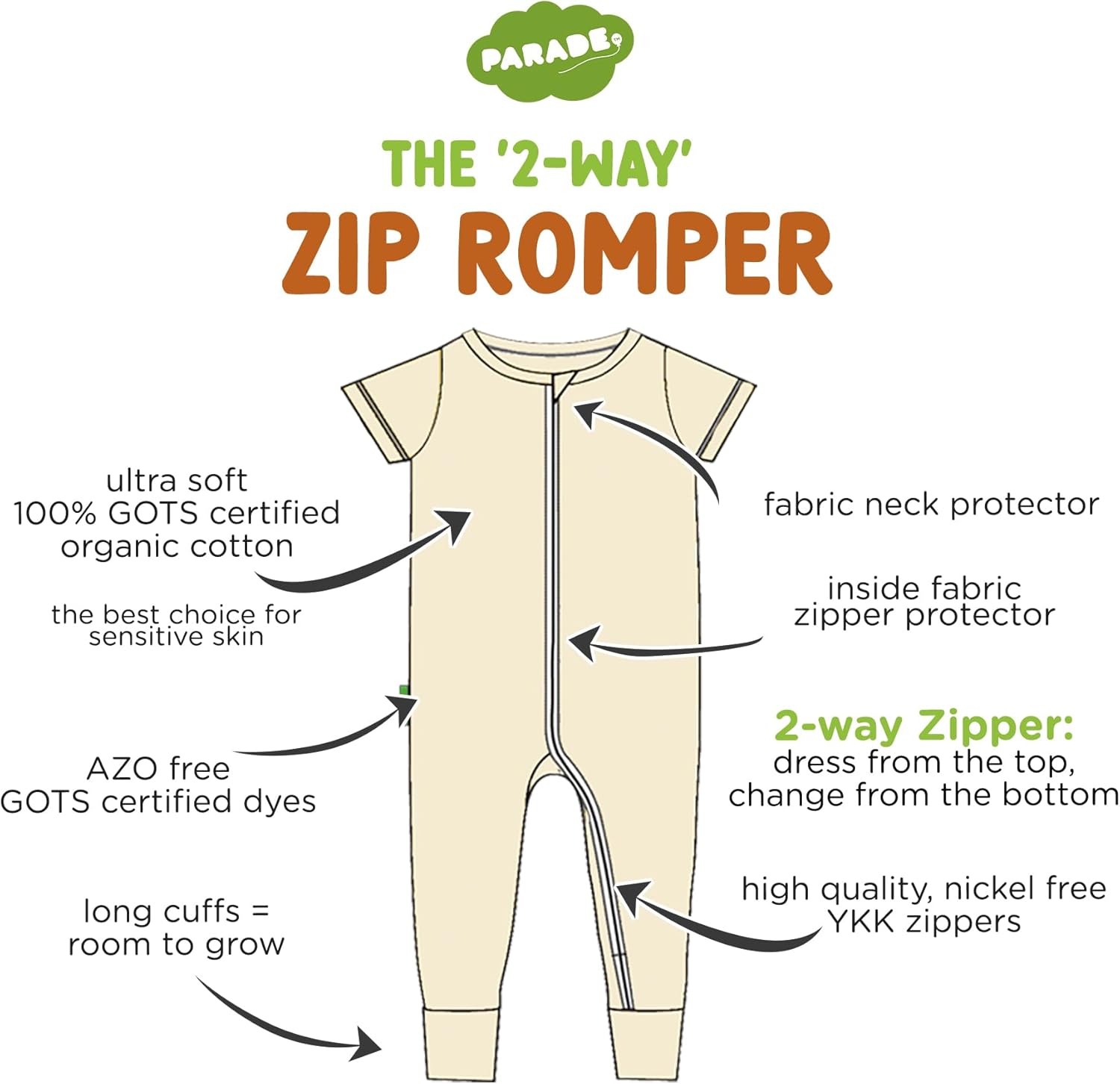 Parade’s organic cotton rompers are designed for ultimate comfort & ease. Discover an easier way to dress your baby – our ‘2-way’ double zip style allows for quick changes and cuddly comfort. Simply zip down from the top for dressing, zip up from the bottom for changes, all without exposing baby’s tummy, and no pulling over the head. Features include inner zipper fabric backing and neck fold to protect gentle skin.