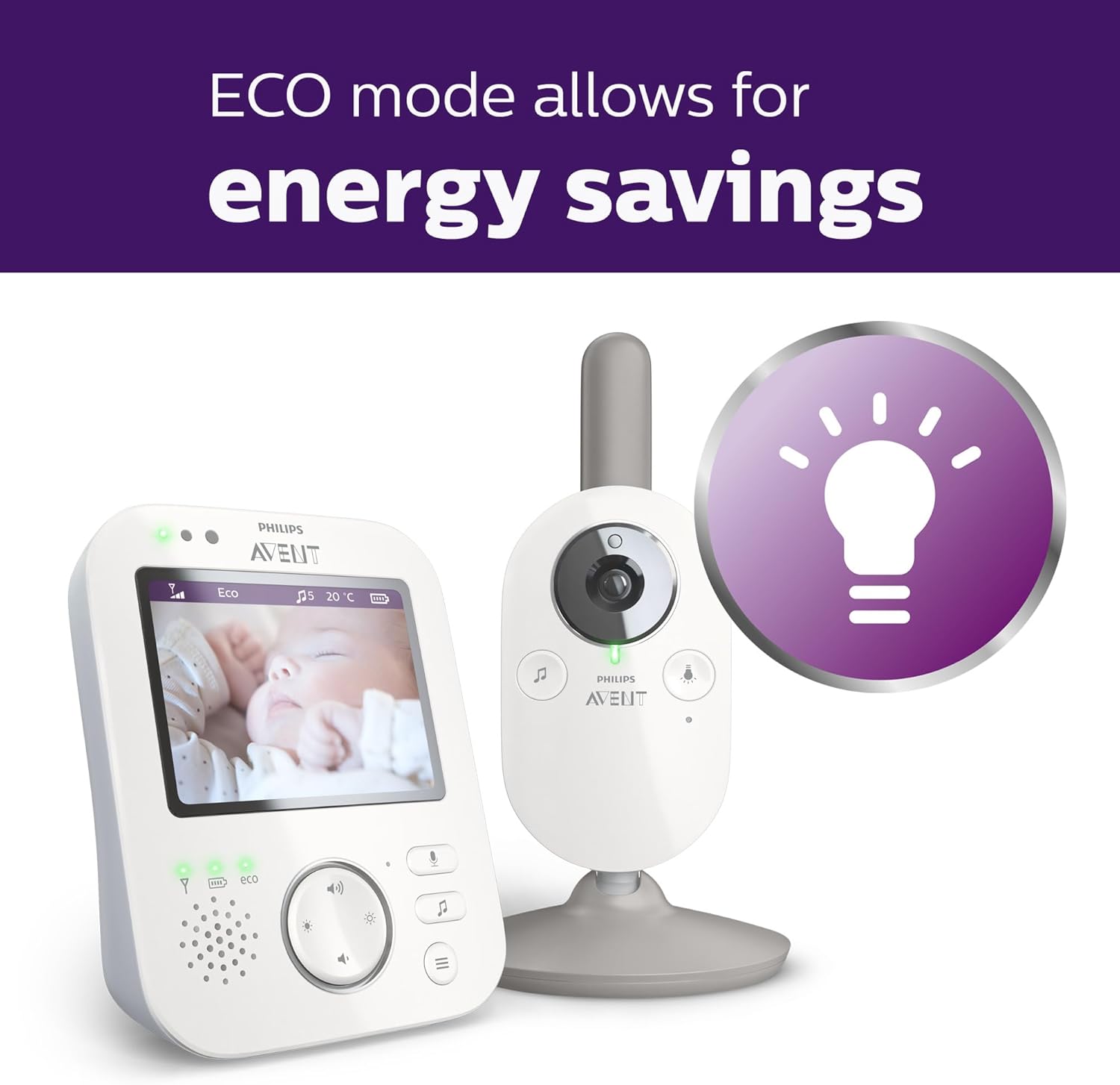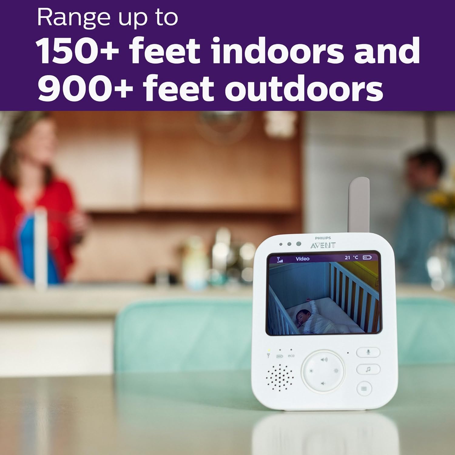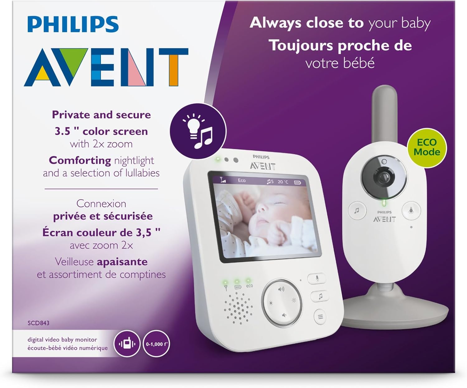 See and hear your baby from anywhere in the home. The Philips Avent Video Baby Monitor enables you to maintain a secure connection with your baby at all times. As well as perfect sound quality, you can now also see your baby, day or night, with a high resolution 3.5” color screen, and an automatic infra-red night vision. You can also soothe your baby by remotely selecting lullabies and by using the soft baby nightlight. With a 100% private connection, and a range up to 900+ feet, this monitor is fully portable and easy to use, and can be voice activated where the screen and volume switch on if your baby starts crying. There is a rechargeable parent unit, and a wall mountable baby unit. LED lights show you when the unit is linked and in range, and there is a backup battery function in case of power failure. Easy to carry.