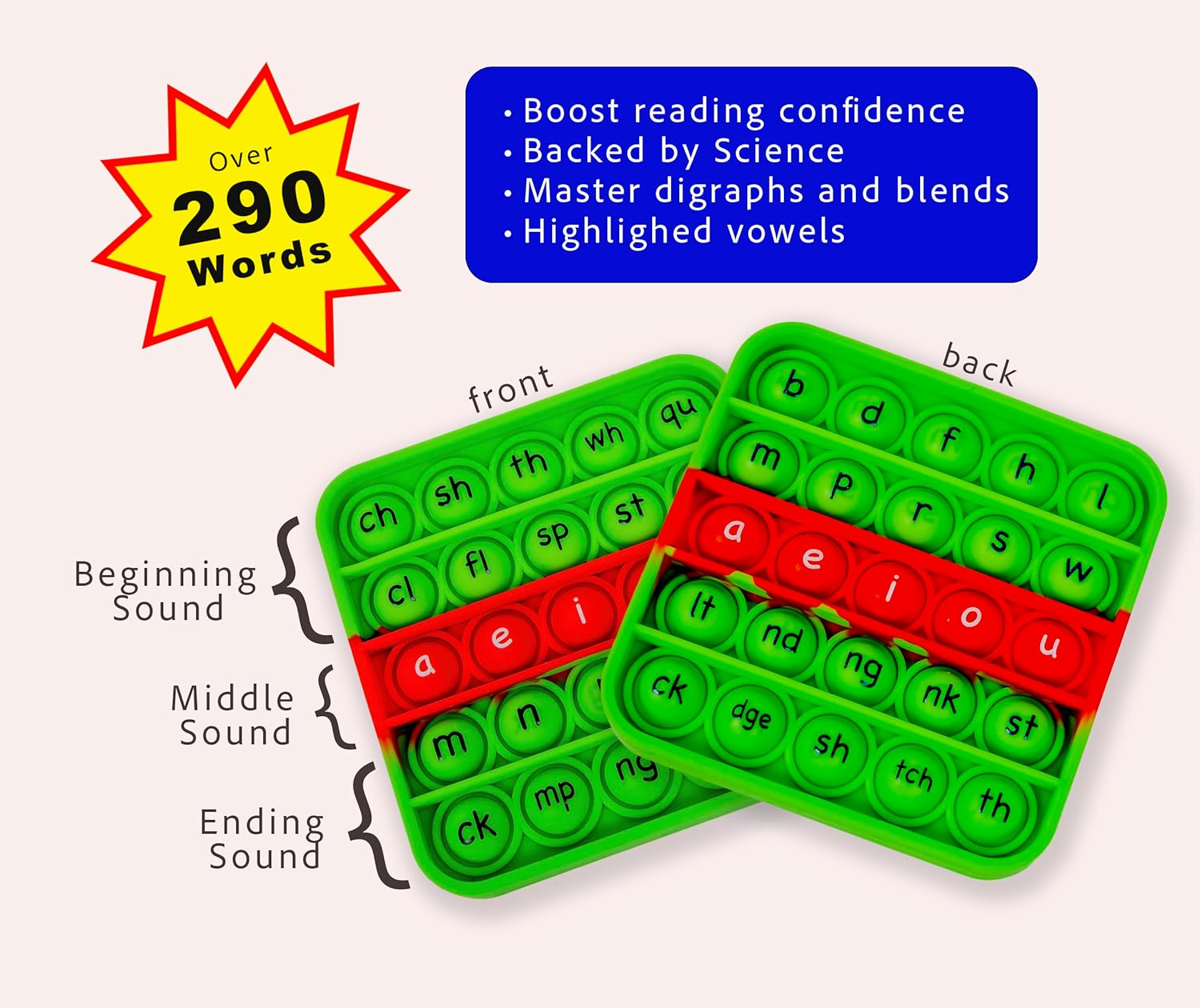 Makes over 290 Digraphs and Blends words for word beginnings and endings Double-sided fidget mat with highlighted vowels40 double-sided flashcards for popping and rhymingAligned with the Science of Reading and best practices on how kids learn to readDownloadable worksheets and word lists