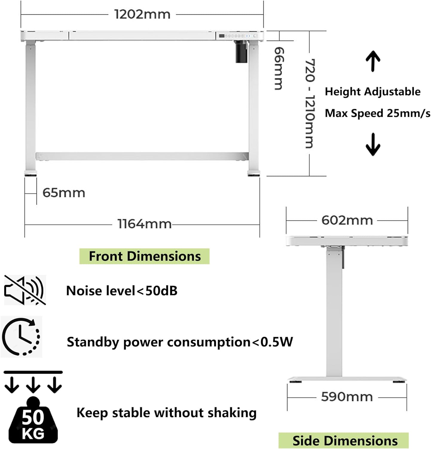 Operation Electric Height adjustment range 28.3’’-47.6’’/720-1210mm Desktop size width 47.3”/1202mm; depth 23.7” /602mm Load Capacity 110lbs/50kg Maximum speed 25mm/s Noise level <50dB Standby power consumption <0.5W All-in-One Desk Frame, Desktop and packaging integrated design Color White