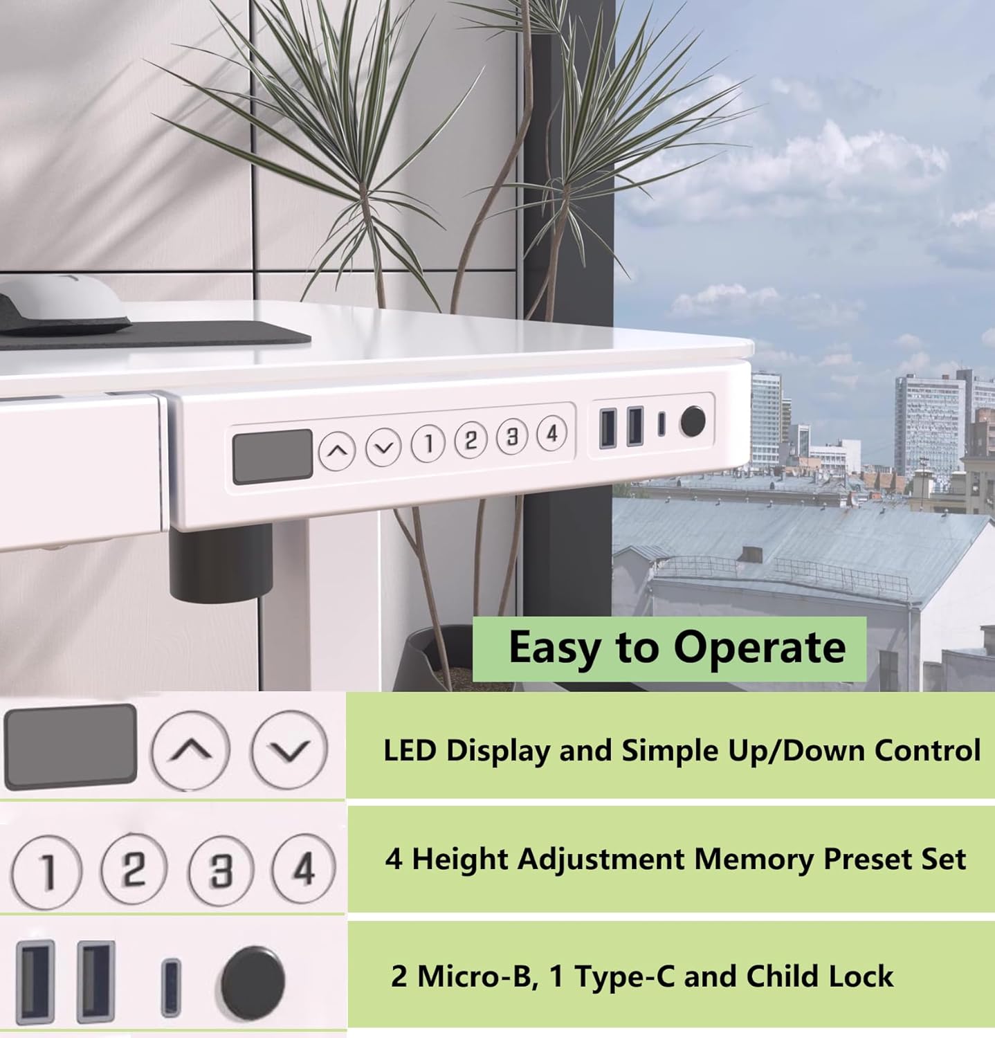 【Convenient USB Charging】The adjustable standing desk comes with a control pad with four memory pre-settings, a safety lock and 3 charging ports, Can lock and unlock the touch controls by pressing the button on the right-hand side.