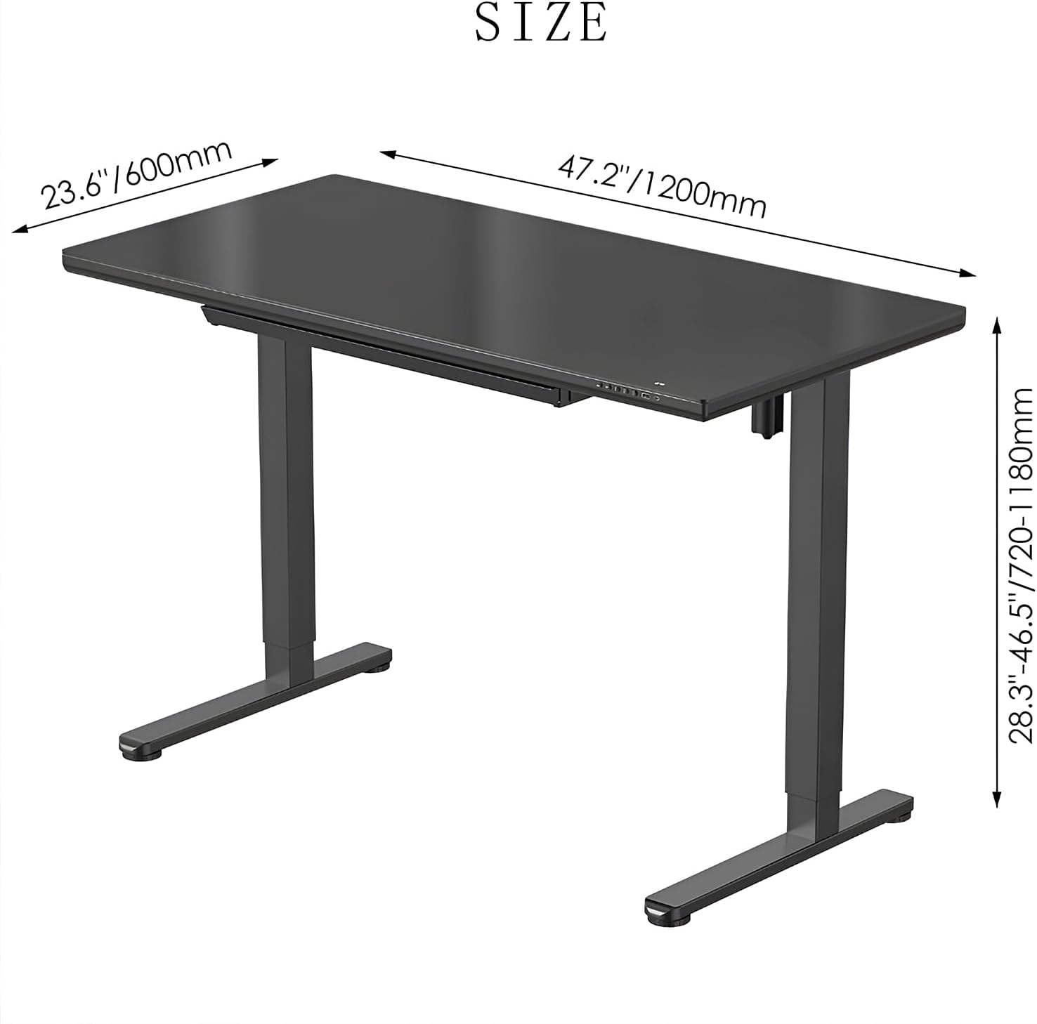 Desktop Size 47.2 x 23.6in/1200 x 600mm Weight Capacity 50kg/110lbs Height Range 28.3-46.5in/720-1180mm Control Setting 5 Keys(Up & Down + 3 Memory Keys), 1 USB, 1 Type-C Column Size 60 * 60mm Max Speed 20mm/s Power Input 100-240V Package 1/pack