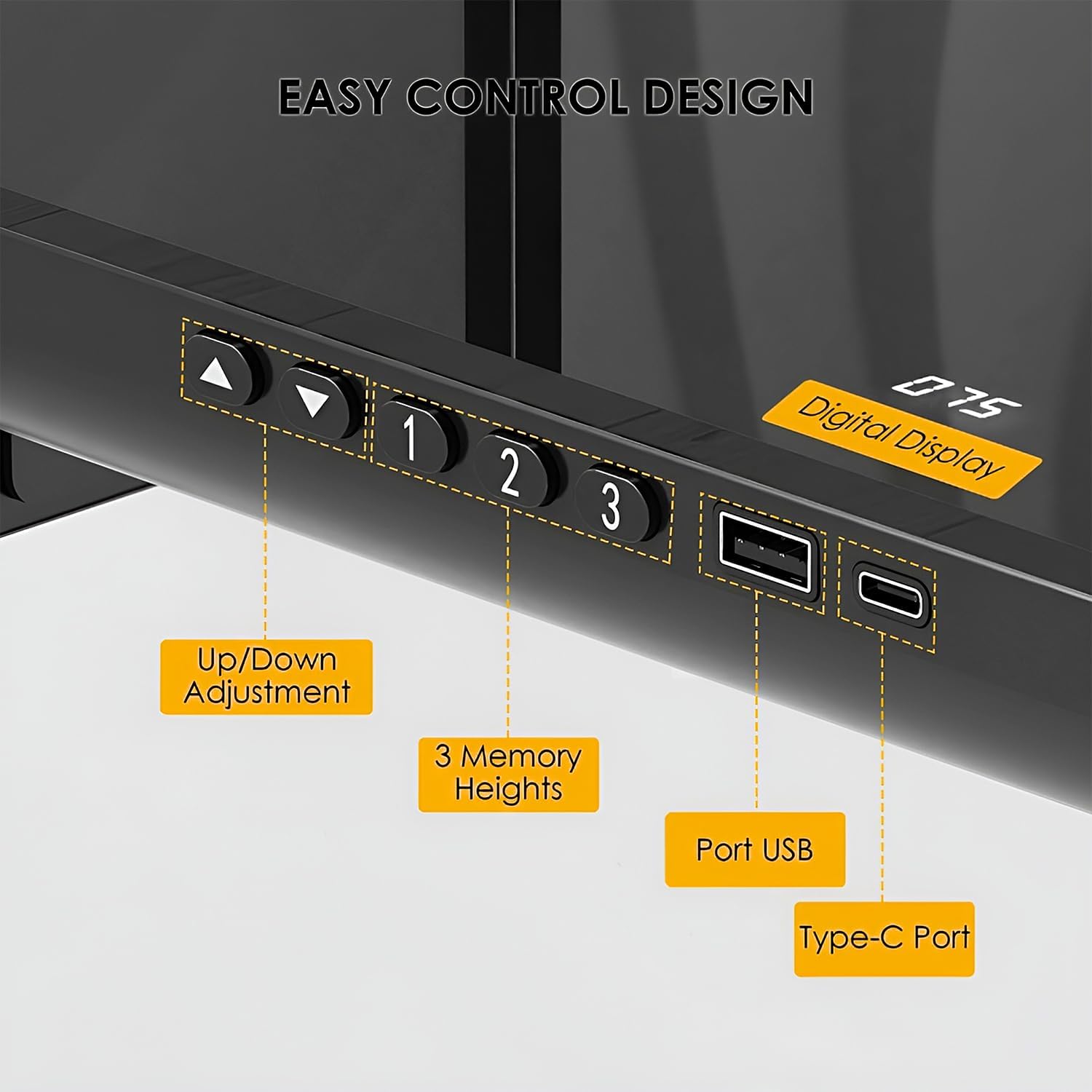 Stand up desk for quick and convenient adjustments, 5 keys(up & down + 3 memory keys), 1 USB, 1 type-c