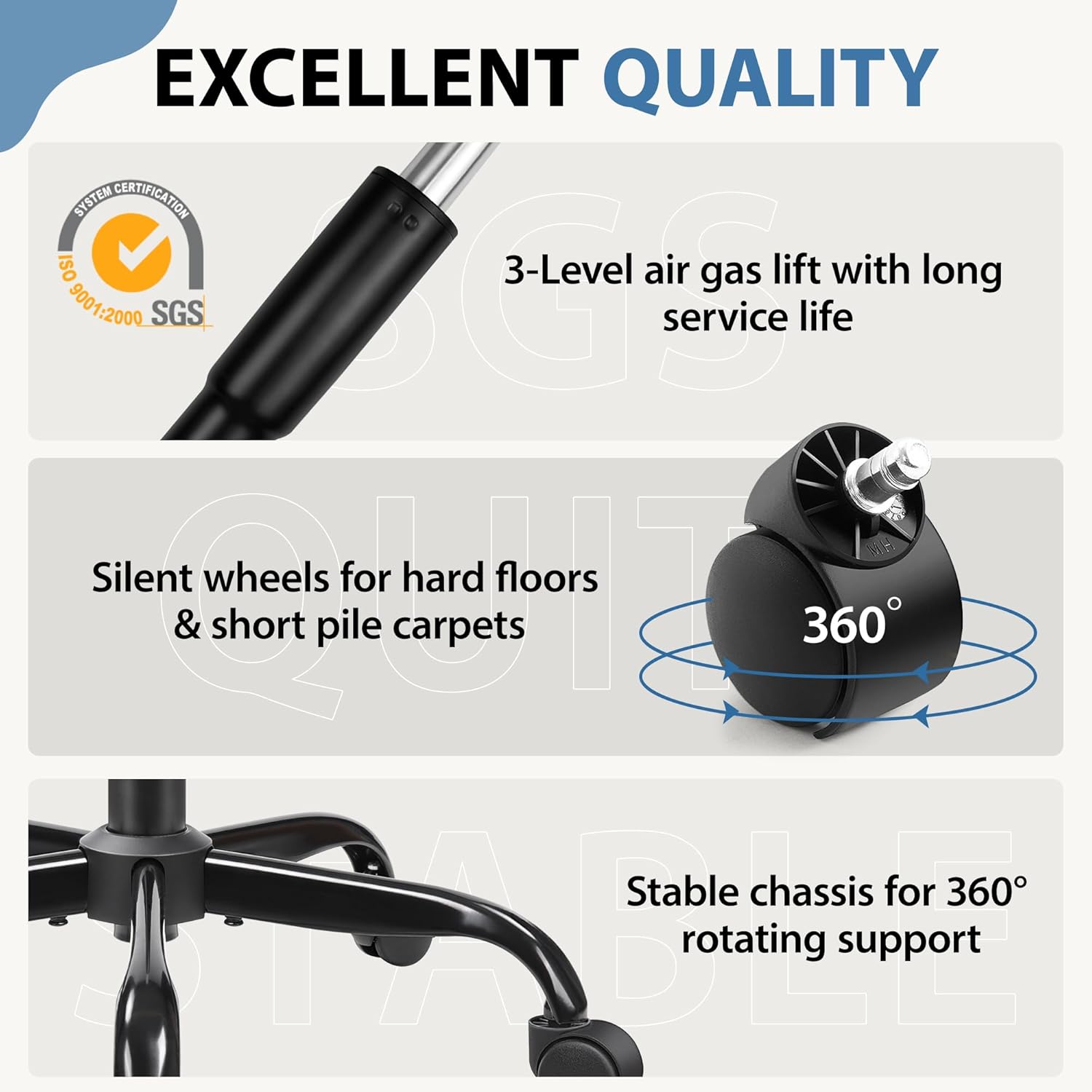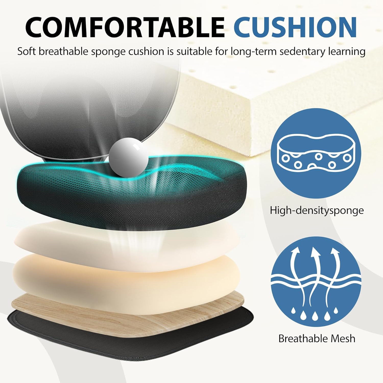 Sturdy & Durable: The adjustable office chairs adopt a sturdy three-level air rod and thickened explosion-proof bottom plate, which not only has a strong load-bearing capacity of 250 pounds but also improves the safety and stability of use. Breathable mesh chair ensures air circulation, keeping you cool while working. High-density seat cushions are comfortable, preventing sweating during prolonged learning.