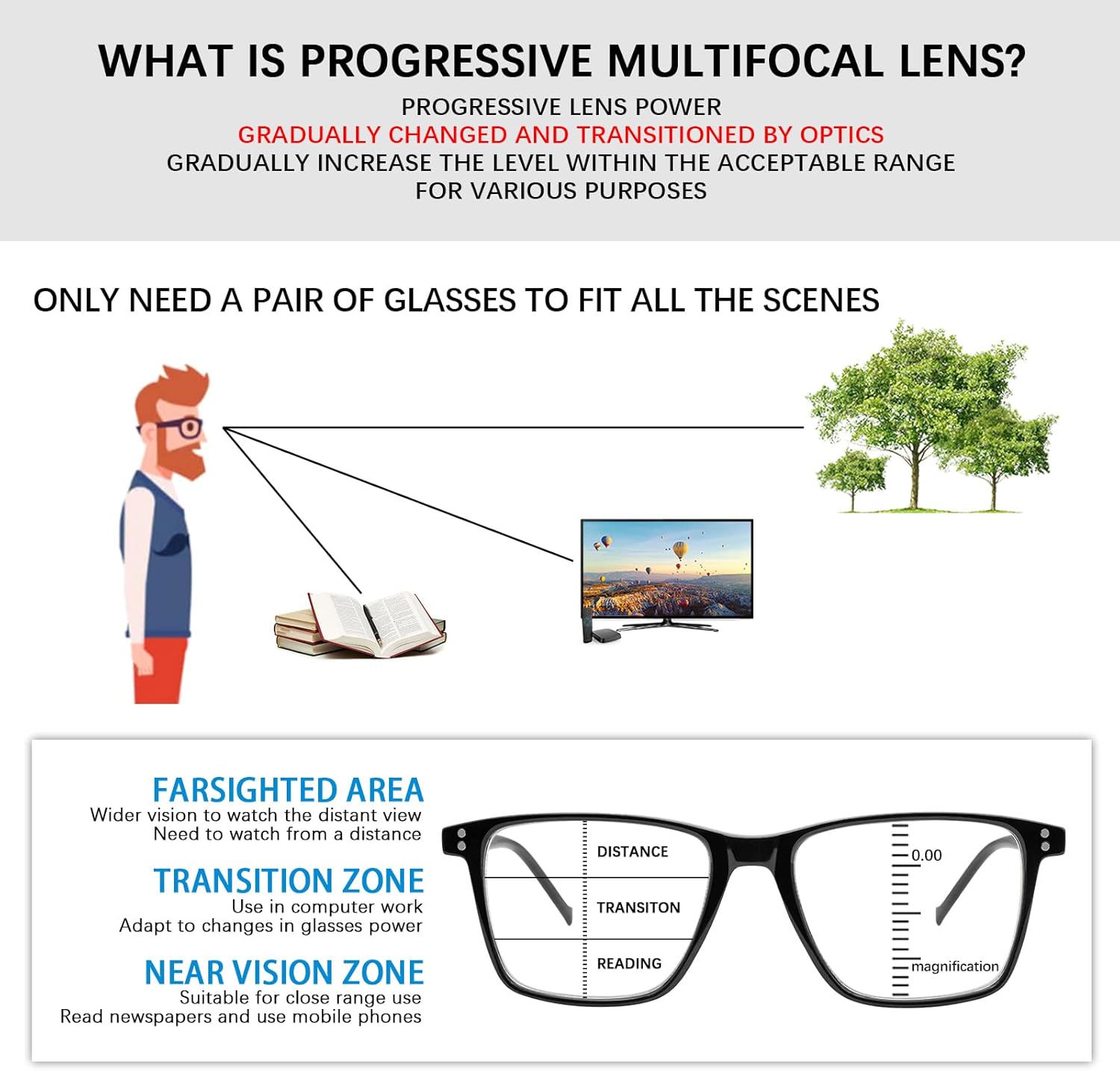 These progressive glasses really are progressive and work beautifully up close, on the computer and across the room. My pair went from 3 at the bottom of the lens to 1.5 at the top portion with easy transition and excellent results.I received on black pair, one brown patterned and one lighter blue .. which I’ll wear in private… but they are well designed and quite solid.If you pick your strengths correctly you’ll probably be as suprised as I am at what a great deal they are. Good luck. … not that luck exists as Socrates showed us long ago..