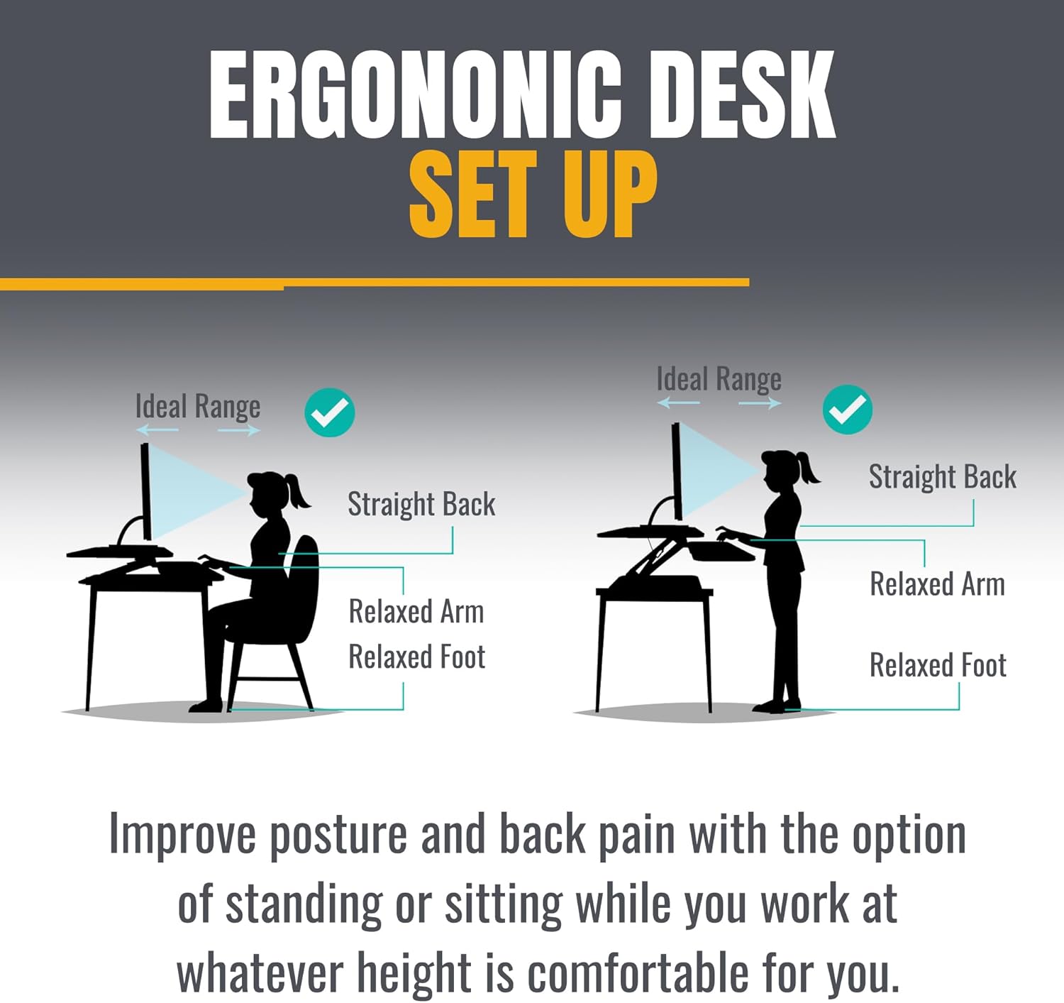 I ordered this because I have lower back problems that cause my legs to fall asleep when I sit too long, but I’m at my desk most days for 6 hours or more. I needed a solution. I found this awesome stand-up desk and was very impressed by the quality. I have also noticed this gives my wrists a break from the same repetitive motion and my neck from looking down so much. The height can be adjusted to your comfort for your neck, wrists and back.I loved it came pre-assembled, other than the keyboard. I was able to use it right out of the box. Super happy with my purchase.