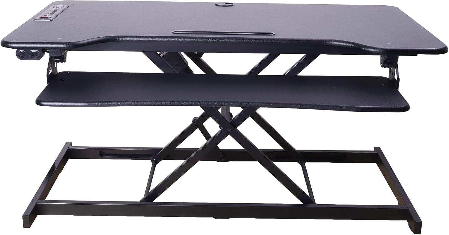 Extra large electric stand up desk workstation – 46″x23.6″ desktop work surface can hold three monitors up to 27″ or two monitors up to 34″; 35″x10″ keyboard tray can also hold a laptop, plus your mouse while keeping arms in an ergonomic position.