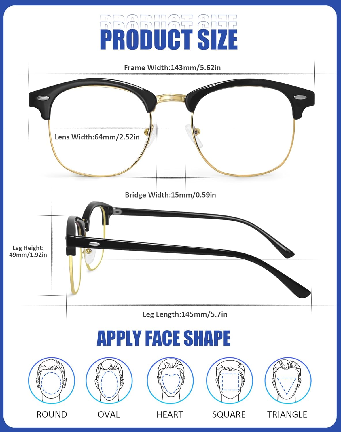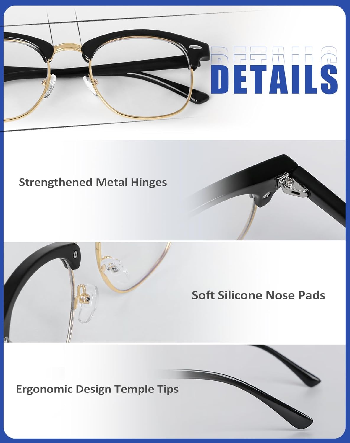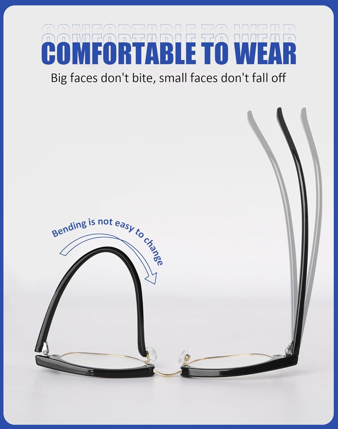 Lightweight and Durable: Enjoy lightweight comfort with upgraded anti-blue light glasses. The impact-resistant PC frames reduce pressure on your ears and nose, ensuring a comfortable wearing experience. With a stylish rounded half-frame design in two versatile colors, these glasses effortlessly combine fashion and functionality.